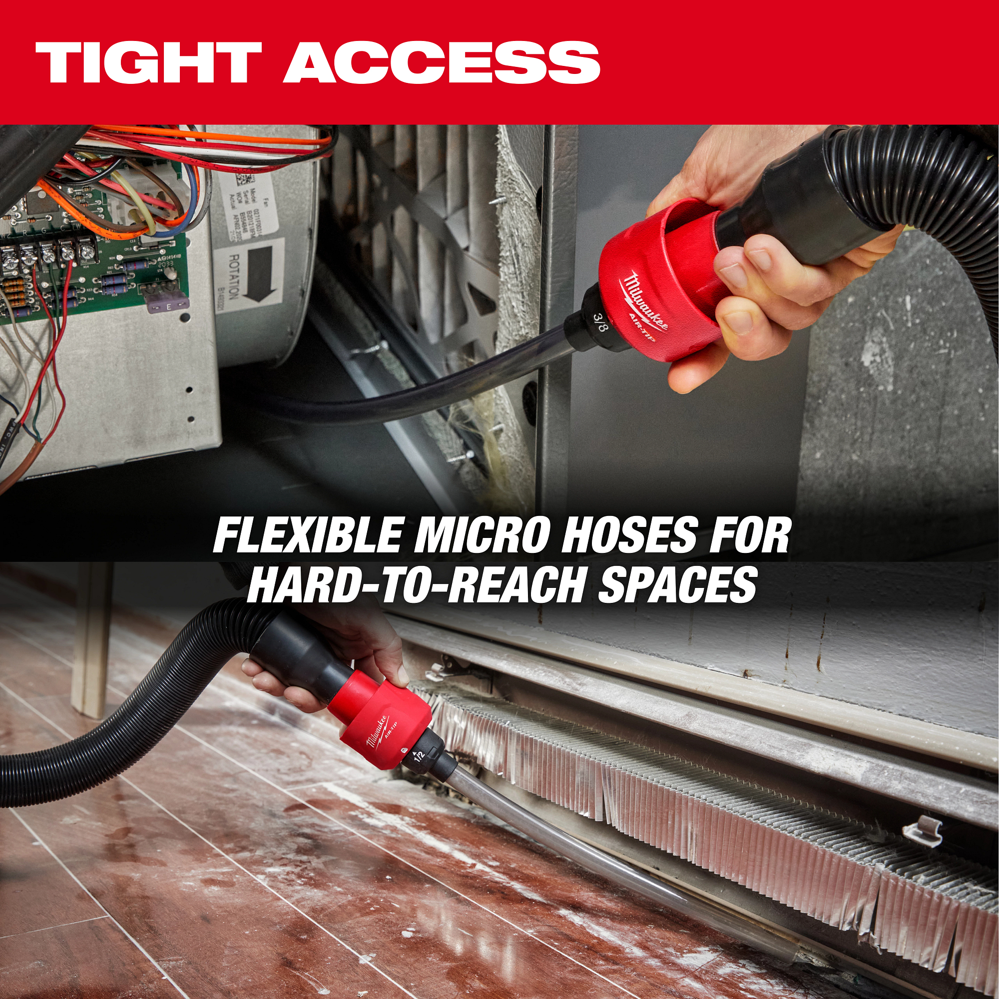 The MILWAUKEE® AIR-TIP™ Long Reach Flexible Micro Hose Set reaches where most vacuum tools cannot go with five interchangeable hose lengths and diameters for many hard-to-reach spaces. Install different hose tubes based on cleaning needs with a quick quarter turn. This vacuum hose kit includes (1) 5/8″ x 2′ Flexible Hose, (1) 3/8″ x 2′ Semi-Ridgid Tube, (1) 1/2″ x 1′ Flexible Hose, (1) 3/8″ X 1′ Flexible Hose, (1) 1/4″ X 1′ Flexible Hose, and a durable vacuum hose storage case. The AIR-TIP™ Long Reach Flexible Micro Hose Set is compatible with other wet/dry vacuum brands with 1-1/4”, 1-7/8”, 2-1/2” diameters, and is part of the AIR-TIP™ family of Trade Focused Vacuum Accessories.