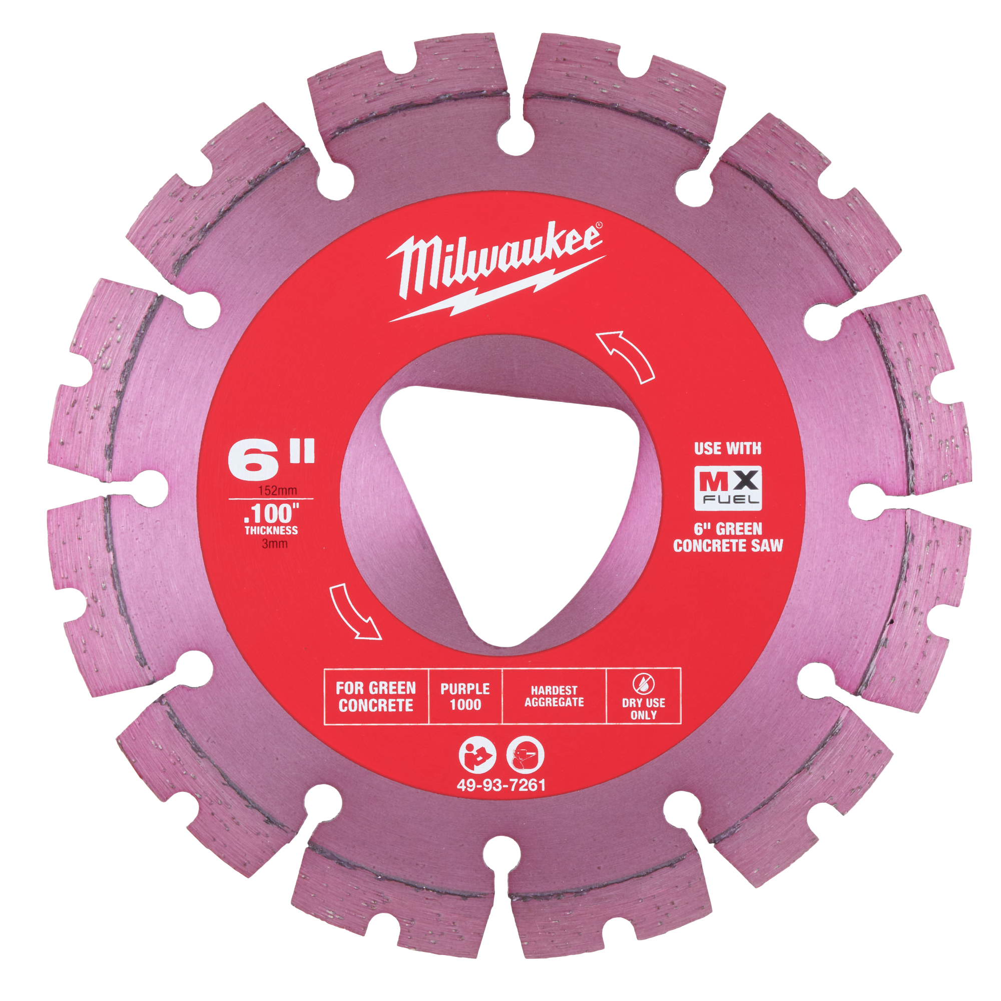 The MILWAUKEE® 6” x .100” Diamond Blades for Green Concrete are engineered to cut up to 70 more ft. of green concrete per charge, meaning less down time and more productivity. The u-notch design provides up to 30% faster cutting speeds, while the laser weld allows for increased durability in the hardest aggregates. Milwaukee® blades are engineered with keyhole gullets for rapid debris removal and extended blade life. These blades are optimized for performance with the MILWAUKEE® MX FUEL™ 6” Green Concrete Saw and are compatible with all 6” triangle arbor green concrete saws. Pair with MX FUEL™ 6” Green Concrete Saw (MXF316-2XC), MILWAUKEE® .100” Joint Protectors (49-93-7268) and MILWAUKEE® 6” Skid Plate (49-93-7260) for a full green concrete cutting solution. The Diamond Blades for Green Concrete are available in yellow, orange, red, green, and purple to provide a solution for all concrete types in soft to hard aggregate applications. For dry use only.
