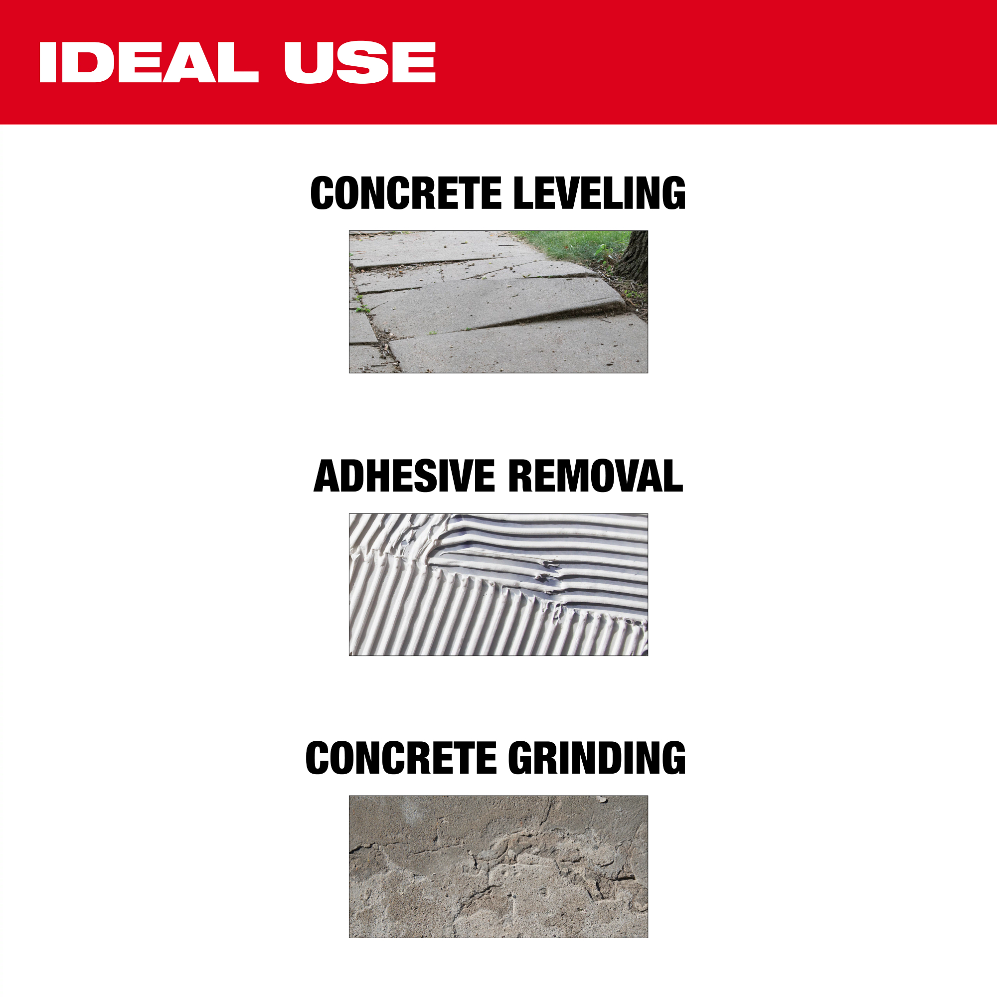 The MILWAUKEE® DIAMOND MAX™ Double Row Diamond Cup Wheels deliver up to 2X faster material removal. Milwaukee’s unique diamond formula provides up to 5X life on concrete. The double-row cup wheels have increased surface contact for increased grinding control and a smooth surface finish. These diamond cup wheels are designed with a vented core for efficient dust extraction. Ideal for use in grinding concrete, leveling, and adhesive removal. Equipped with 5/8″-11 threaded arbor for use in angle grinders. For use wet and dry.