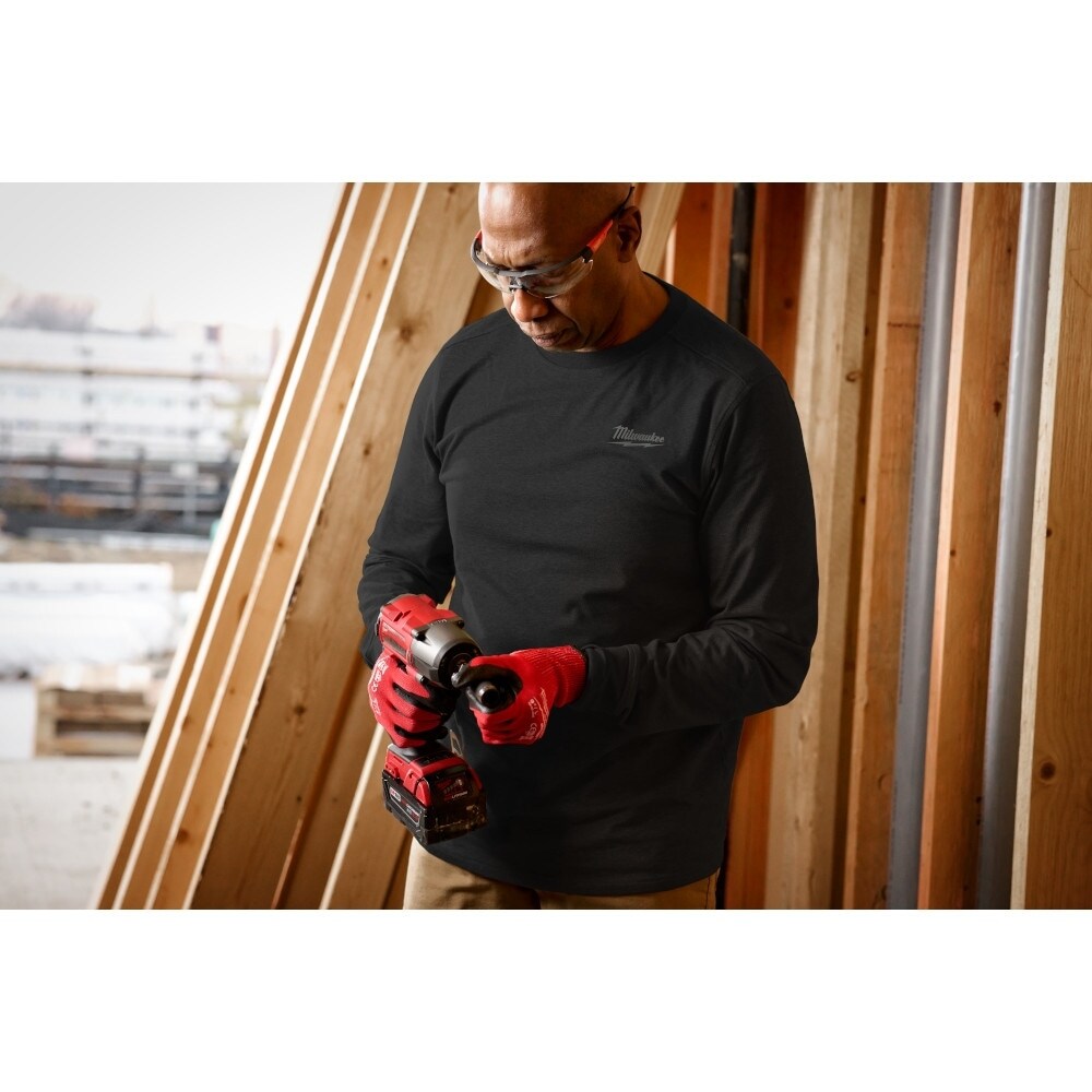 Part of the MILWAUKEE® FREEFLEX™ Collection, our Long Sleeve Hybrid Work Tee is BUILT FOR MOVEMENT. Our Long Sleeve Hybrid Work Tee is a lightweight and breathable solution that allows you to STAY COMFORTABLE and KEEP COOL. This work t-shirt is specifically created for mobility and durability with its drop shoulder design to reduce wear on the seams. The MILWAUKEE® Hybrid Work Tee Shirts are built to protect against the elements, offering UPF 50 protection for those warm days on the jobsite and moisture-wicking fabric so you can stay dry while working. Choose from a variety of colors, including black, blue, gray, and green, available in sizes small to 3XL.
