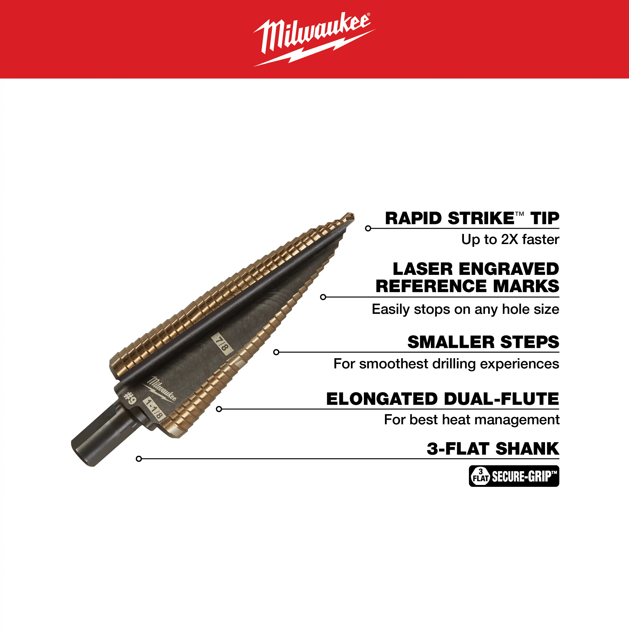 The MILWAUKEE® #9 Cobalt Step Drill Bits are engineered to deliver up to 15X the life in stainless compared to current solutions and up to 1000 holes in mild steel. The Cobalt Step Drill Bits are recommended up to 14ga. The elongated dual-flute design also offers the best heat management combined with the smaller steps for smoothest drilling experience and a Rapid Strike™ tip that allows for 2X faster starts in stainless. Made in the USA with global materials, these step bits have best-in-class performance in cordless drills used on low-speed in Stainless Steel and high speed for mild steel.