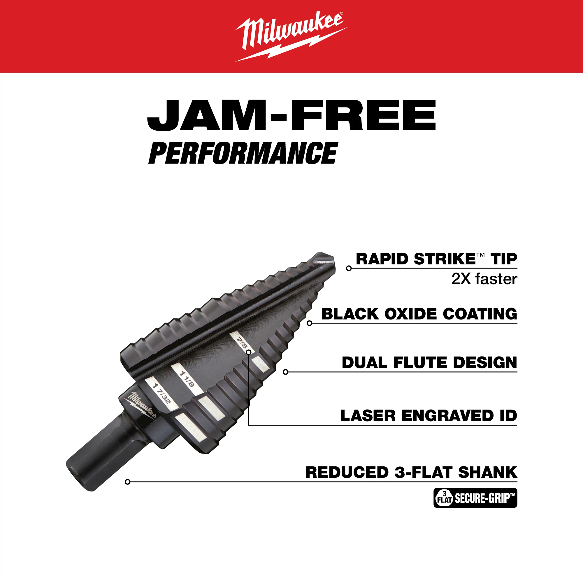 Milwaukee® step drill bits with jam-free performance feature a dual-flute design delivering up to 2X faster hole times, up to 4X longer life and up to 50% more holes per battery charge than competitors. Ideal for drilling small and large-diameter holes in steel and plastic, these bits are optimized for cordless drills in high speed. The Rapid Strike™ tip allows for a fast and accurate start that generates less heat, resulting in longer bit tip life. Black oxide coating also enhances durability, hole quality and bit life. For user convenience and accuracy, each bit has laser-engraved reference marks you can see while drilling. The 3-flat Secure-Grip™ shank ensures a solid connection with the drill chuck. The #11 step drill bit has 3 hole sizes ranging from 7/8 in. to 1-7/32 in.. jam-free performance in high speed with most professional 18 Volt cordless drills with lithium-ion battery technology.