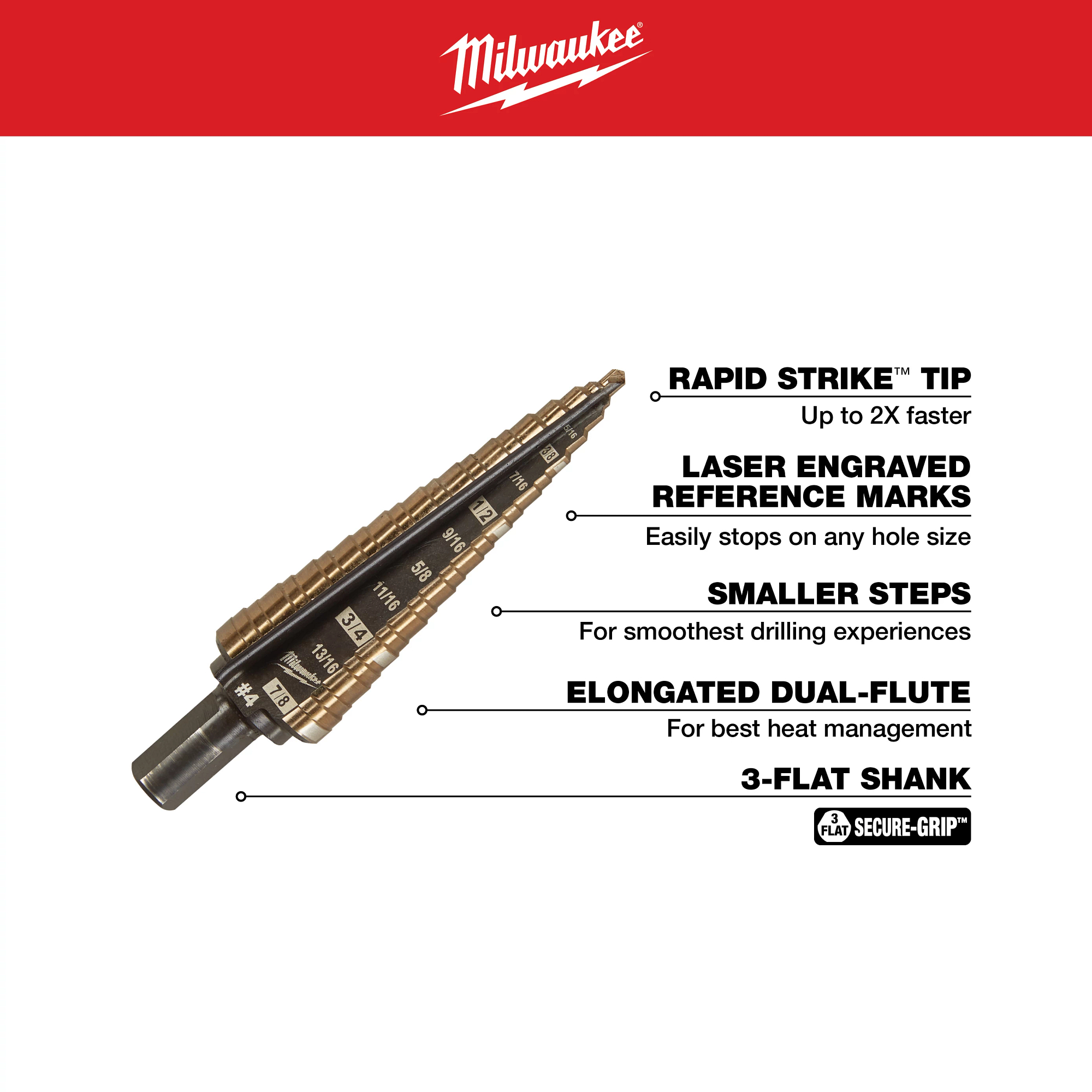 The MILWAUKEE® #4 Cobalt Step Drill Bits are engineered to deliver up to 15X the life in stainless compared to current solutions and up to 1000 holes in mild steel. The Cobalt Step Drill Bits are recommended up to 14ga. The elongated dual-flute design also offers the best heat management combined with the smaller steps for smoothest drilling experience and a Rapid Strike™ tip that allows for 2X faster starts in stainless. Made in the USA with global materials, these step bits have best-in-class performance in cordless drills used on low-speed in Stainless Steel and high speed for mild steel.