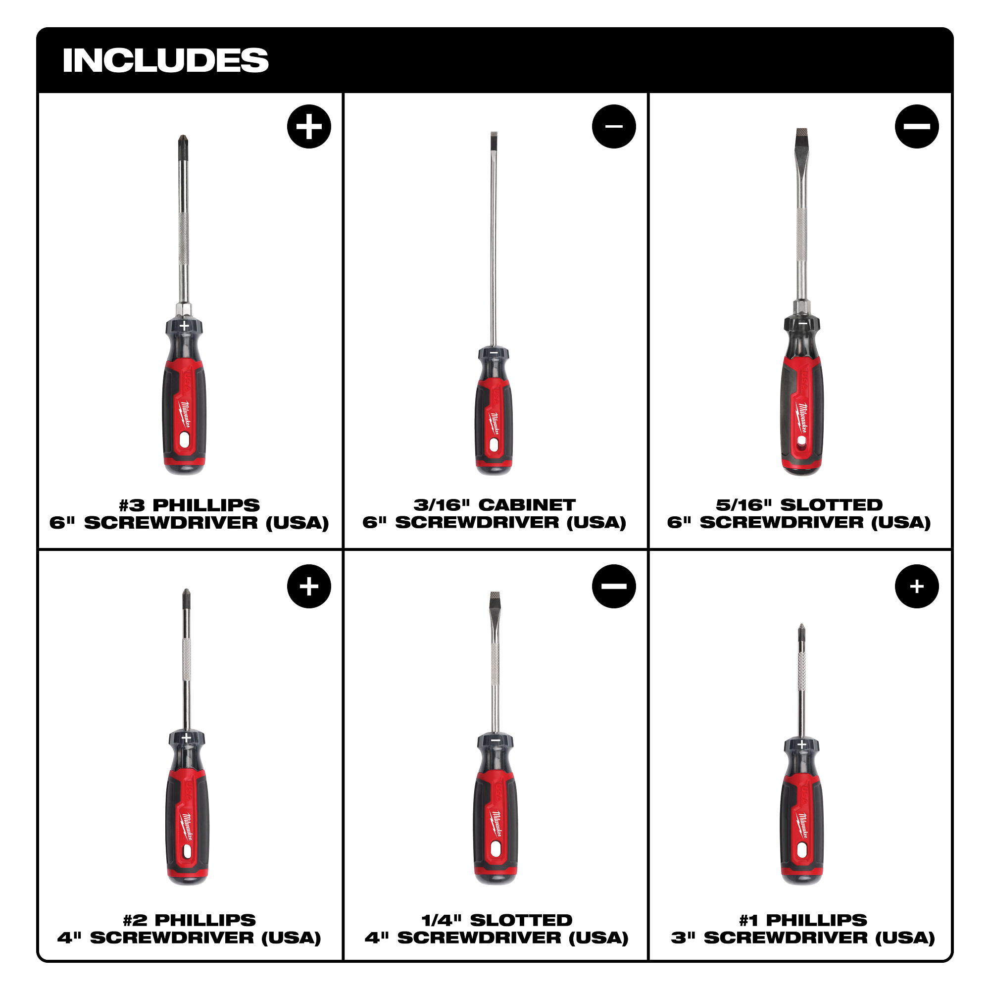 The Milwaukee® 6-Piece Cushion Grip Screwdriver Set (USA) is manufactured to give the professional the best-fitting screwdriver with max grip. These screwdriver tips are custom machined to deliver a precise fit and reduce stripping during demanding fastening applications. For added confidence, the tips are laser etched to increase the gripping surface. Manufactured with high-strength, boron-infused steel for increased hardness, these screwdrivers stand up to the demands of the site with ultimate durability and life. Providing increased versatility, select screwdrivers include a wrench-ready bolster for added torque and a knurled shank for precision control. Quick identification markings on the handle make it easy to identify screwdriver tip size including Phillips, slotted, and cabinet tips. The 6-Piece Set includes screwdrivers offered in 3-inch to 6-inch shank lengths. The Milwaukee 6-Piece Cushion Grip Screwdriver Set is made in the USA with cutting-edge manufacturing technology and the highest quality USA-sourced materials all backed by a complete Lifetime Guarantee.
