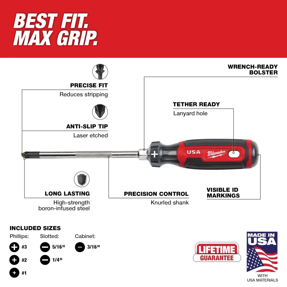 Made with high-strength, boron-infused steel for greater hardness, these screwdrivers are designed for jobsite durability and long service life. For added versatility, select drivers include a wrench-ready bolster for extra torque and a knurled shank for precision control. Quick ID markings on the handle make it easy to spot tip type and size (Phillips, slotted, and cabinet), and the set includes 3″ to 6″ shank lengths. Proudly made in the USA with USA-sourced materials and backed by a Lifetime Guarantee.