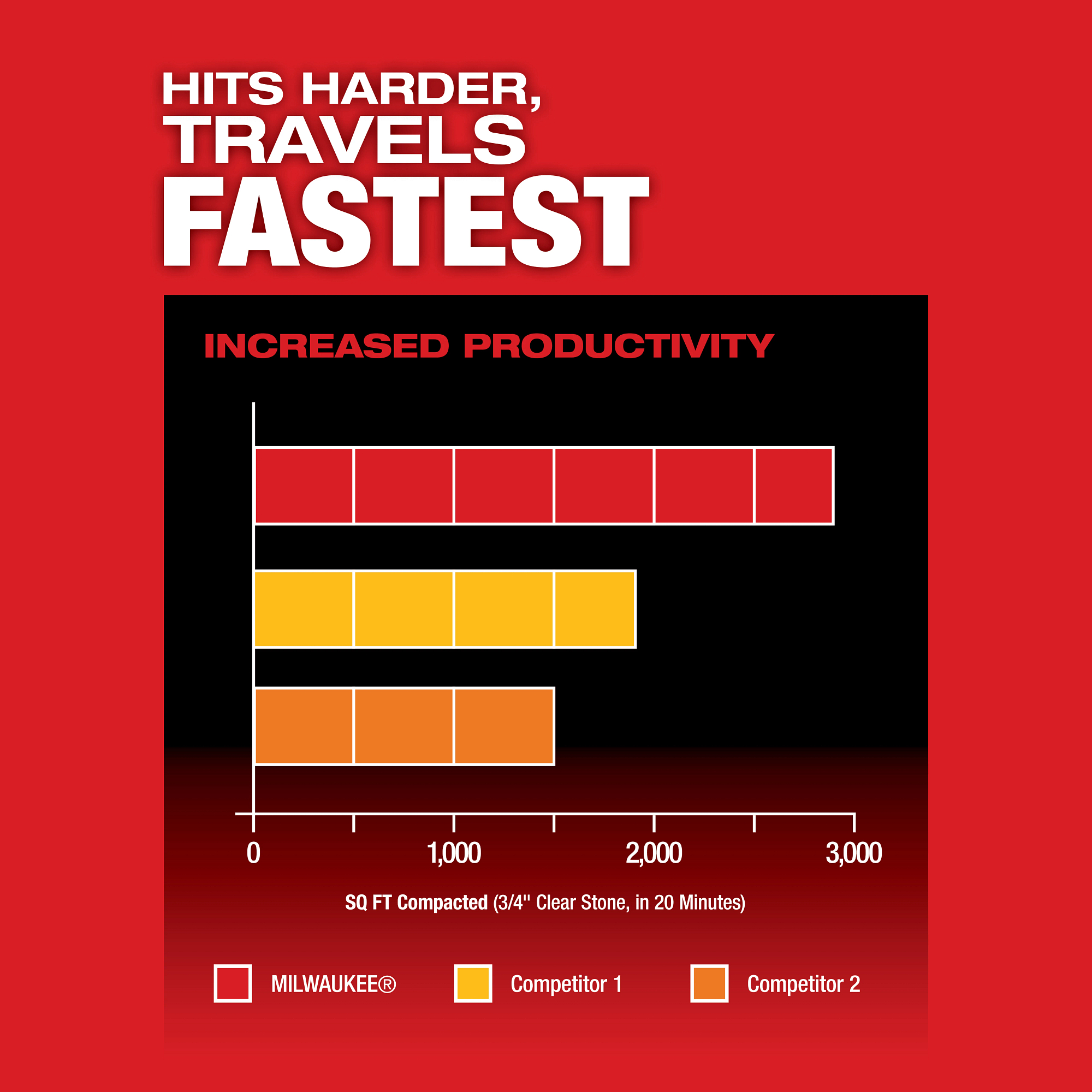 The MILWAUKEE® MX FUEL™ 20” Plate Compactor provides the most productive and reliable compaction. The POWERSTATE™ Brushless Motor delivers the power to hit harder and travel faster for maximum productivity without sacrificing compaction performance. The plate compactor provides no gas headaches with push button start and no regular maintenance, reducing downtime and allowing you to get jobs done faster. Zero emissions mean a safer workspace indoors and in trenches. It also offers greater control with multi-direction capability and fast/slow speed control for easier maneuverability around forms. The MX FUEL™ 20” Plate Compactor is kitted with (2) MX FUEL™ REDLITHIUM™ FORGE™ HD12.0 batteries & a Super Charger. In just 65 minutes, you can charge an MX FUEL™ REDLITHIUM™ FORGE™ HD12.0 to 100%. Both the MX FUEL™ REDLITHIUM™ FORGE™ HD12.0 Battery & MX FUEL™ Super Charger are COOL-CYCLE™ Capable. COOL-CYCLE™ Active Cooling System, provides high-speed cooling for less downtime. The active cooling feature works with MX FUEL™ batteries that have COOL-CYCLE™ capability. The MX FUEL™ REDLITHIUM™ FORGE™ HD12.0 Battery gives you 35 minutes of continuous runtime or 5,000 square feet per charge. REDLINK PLUS™ Intelligence ensures optimal performance and provides overload protection to protect your machine and battery during the toughest applications. The MILWAUKEE® MX FUEL™ 20” Plate Compactor is ONE-KEY™ Compatible. You can track, manage, and secure your equipment from your mobile device or computer using the industry’s largest Bluetooth® community tracking network. If your plate compactor is ever lost or stolen, you can prevent tampering with remote lockout capability.