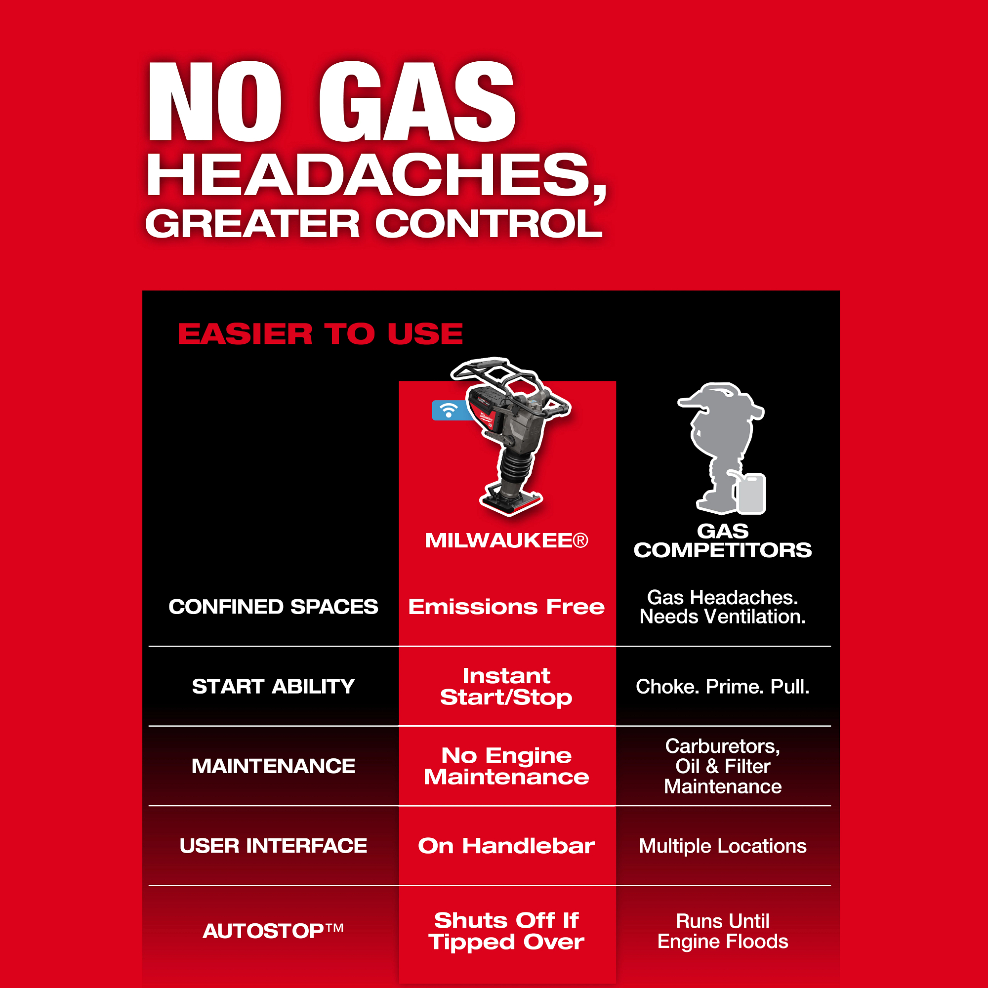 The MILWAUKEE® MX FUEL™ 70 kg Rammer is the most productive and easiest to use. The POWERSTATE™ Brushless Motor delivers the power to hit harder and travel faster for maximum productivity without sacrificing compaction performance. The rammer provides no gas headaches with push button start and no engine to maintain, reducing downtime and allowing you to get jobs done faster. No gas engine means fewer wearable parts, less noise and vibration, and zero emissions mean a safer workplace indoors and in trenches. For greater control and easier maneuverability, our centralized user interface provides you with simple start/stop and fast/slow travel speeds. AUTOSTOP™ technology enhances safety by automatically shutting off the rammer if tipped over. The MX FUEL™ REDLITHIUM™ FORGE™ HD12.0 Battery gives you 25 minutes of continuous runtime or over a 1/4 mile of compaction. REDLINK PLUS™ Intelligence ensures optimal performance and overload protection for your machine and battery during the toughest applications. Both the MX FUEL™ REDLITHIUM™ FORGE™ HD12.0 Battery & MX FUEL™ Super Charger are COOL-CYCLE™ Capable to provide high-speed cooling for less downtime. If your rammer is ever lost or stolen, you can prevent tampering with remote lockout capability. The MILWAUKEE® MX FUEL™ 70 kg Rammer is fully compatible with ONE-KEY™ and our MX FUEL™ Equipment System.