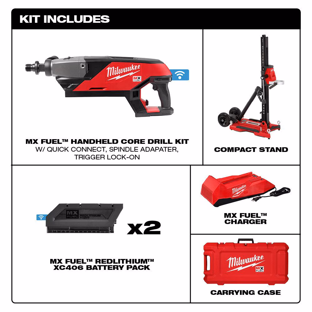 Our MX FUEL™ Handheld Core Drill with Stand allows you to core with more confidence than ever before. A patented clutch and AUTOSTOP™ technology deliver a safer handheld coring experience. They provide you with maximum control and prevent over-rotation in case the core drilling machine gets bound up. The POWERSTATE™ Brushless Motor delivers you the power to core up to 6” holes in reinforced concrete. REDLINK PLUS™ Intelligence ensures maximum performance and protection from overload, overheating, and over-discharge. An onboard LED level and performance gauge provide you with maximum efficiency while coring. These features, along with the option to wet or dry core make it easier for you to core anywhere. The MX FUEL™ REDLITHIUM™ battery pack powers through concrete and block almost anywhere, without the hassle of extension cords or tripping breakers. The cordless core drill is compatible with all MILWAUKEE® MX FUEL™ REDLITHIUM™ batteries, giving you the hardest working and most reliable power for equipment. The diamond core drill is ONE-KEY™ Compatible. You can track, manage and secure equipment from your mobile device or computer using the industry’s largest Bluetooth® community tracking network. If your core drill is ever lost or stolen you can prevent tampering with remote lockout capability. In addition to the handheld core drill, this kit includes our compact core drill stand.