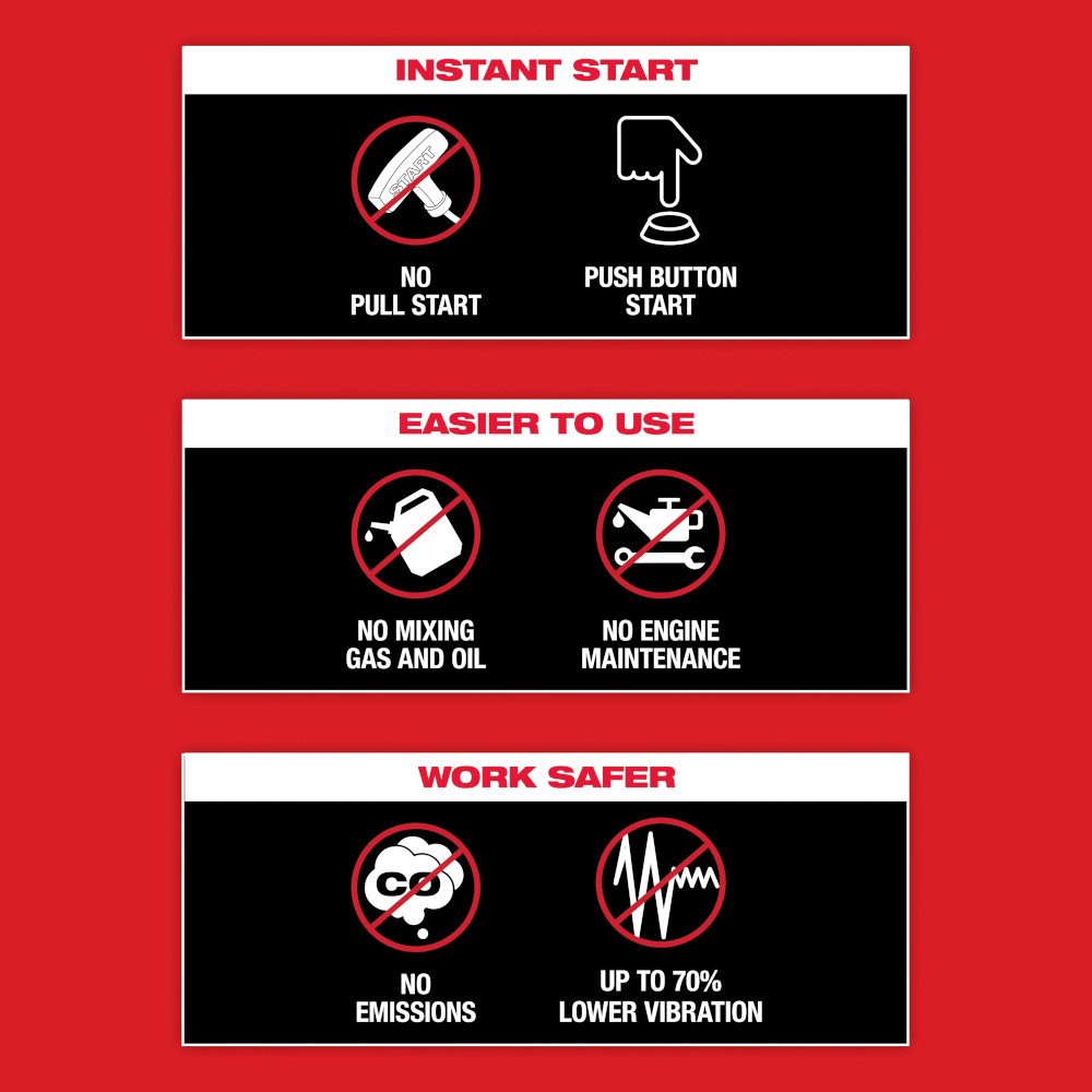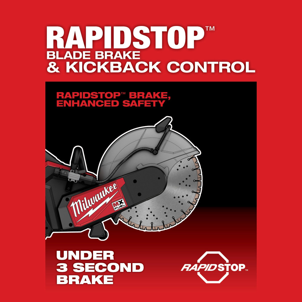 The MX FUEL™ 14 in. Cut-Off Saw w/ RAPIDSTOP™ Brake delivers 14” gas performance with no gas headaches. The POWERSTATE™ Brushless Motor delivers the power to cut tough materials like concrete, rebar, and ductile iron. It delivers instant power with push-button start and eliminates the repetitive motions of a pull start, providing faster cutting from start to finish. No gas engine means fewer wearable parts, less noise and vibration, and zero emissions for a safer workplace indoors or outdoors. RAPIDSTOP™ Blade Brake & Kickback Control provides enhanced safety by stopping the blade in three seconds during regular use and in cases of kickback. With (2) MX FUEL™ REDLITHIUM™ FORGE™ XC8.0 Batteries, it can cut 28 ft fully plunged in concrete or 240 cuts in #5 rebar. In just 45 minutes, you can charge an MX FUEL™ REDLITHIUM™ FORGE™ XC8.0 to 100%. Both the MX FUEL™ REDLITHIUM™ FORGE™ XC8.0 Battery & MX FUEL™ Super Charger are COOL-CYCLE™ Capable. COOL-CYCLE™ Active Cooling System provides high-speed cooling for less downtime. . The REDLINK PLUS Intelligence ensures optimal tool performance and provides overload protections during tough applications. The Saw is ONE-KEY Compatible: Track, manage, and secure equipment from your mobile device or computer. The saw includes a load light indicator that optimizes runtime and blade life, as well as an electric onboard water connection that releases water only when the trigger is released, reducing mess onsite.