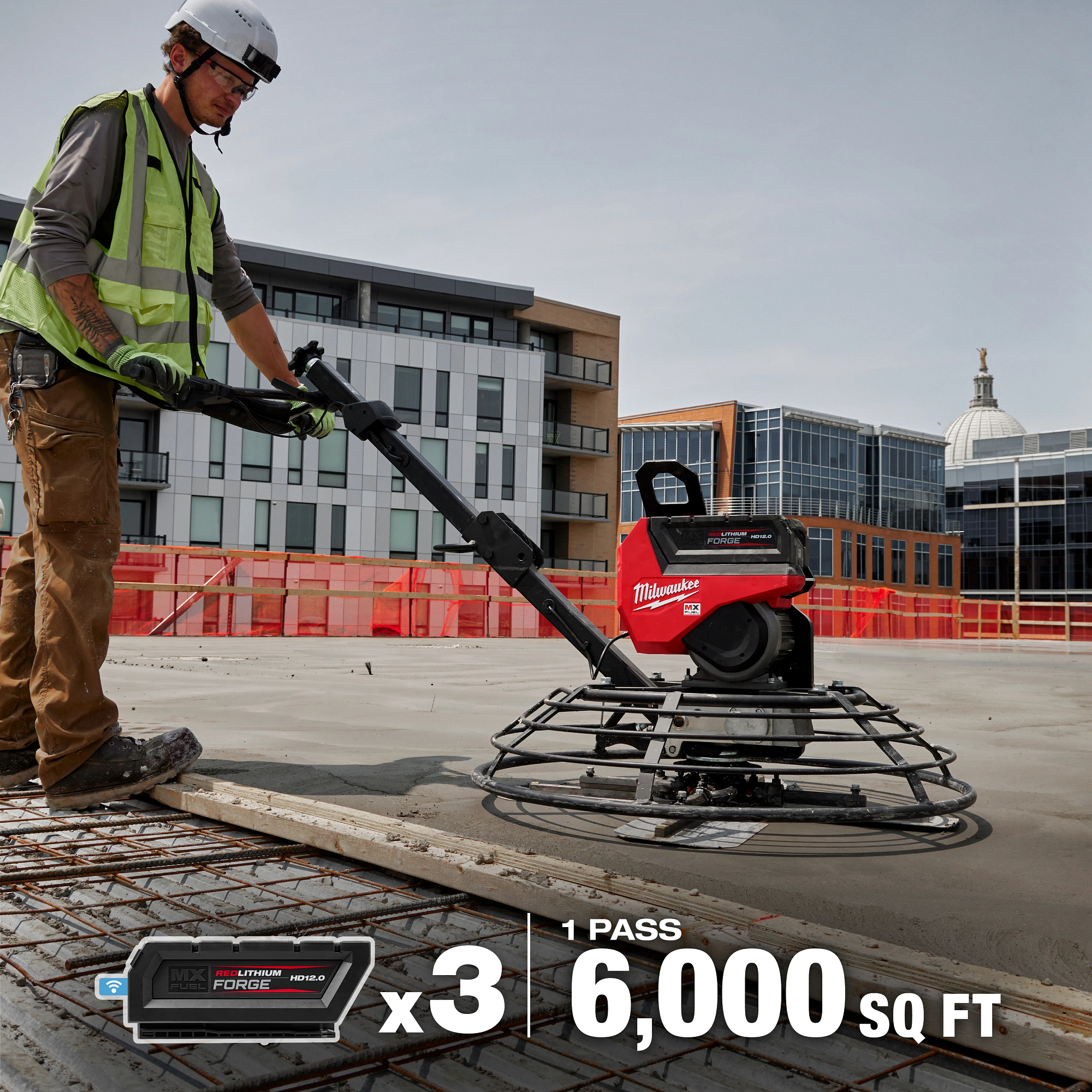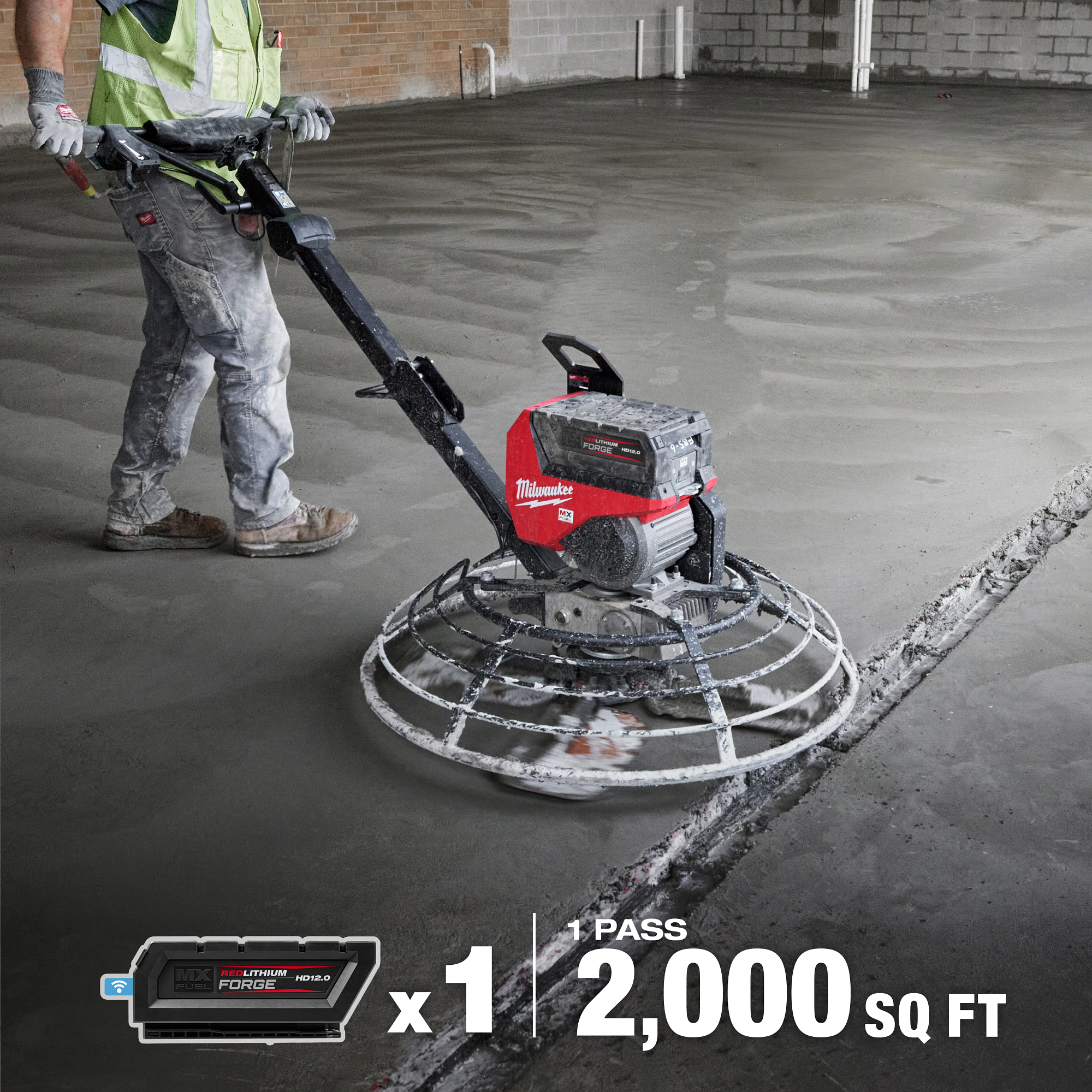The MILWAUKEE® MX FUEL™ 36” Walk-Behind Trowel provides a smooth, balanced finishing experience with 5HP performance, no gas headaches, and 25 min of runtime per charge. The POWERSTATE™ Brushless Motor delivers 5HP performance and unmatched control with a max blade speed of 130 RPM and an ergonomic throttle design. The trowel provides instant power with no gas headaches and requires no regular maintenance, producing less noise and zero emissions for a safer workspace indoors or outdoors. The MX FUEL™ 36” Walk-Behind Trowel is kitted with 3 MX FUEL™ REDLITHIUM™ FORGE™ HD12.0 batteries & a Super Charger. In just 65 minutes, you can charge an MX FUEL™ REDLITHIUM™ FORGE™ HD12.0 to 100%. Both the MX FUEL™ REDLITHIUM™ FORGE™ HD12.0 Battery & MX FUEL™ Super Charger are COOL-CYCLE™ Capable. COOL-CYCLE™ Active Cooling System, provides high-speed cooling for less downtime. The active cooling feature works with MX FUEL™ batteries that have COOL-CYCLE™ capability. REDLINK PLUS™ Intelligence ensures optimal performance and provides overload protection to protect your machine and battery during the toughest applications. The MILWAUKEE® MX FUEL™ 36” Walk- Behind Trowel is ONE-KEY™ Compatible. You can track, manage and secure your equipment from your mobile device or computer using the industry’s largest Bluetooth® community tracking network. If your power trowel is ever lost or stolen, you can prevent tampering with remote lockout capability.