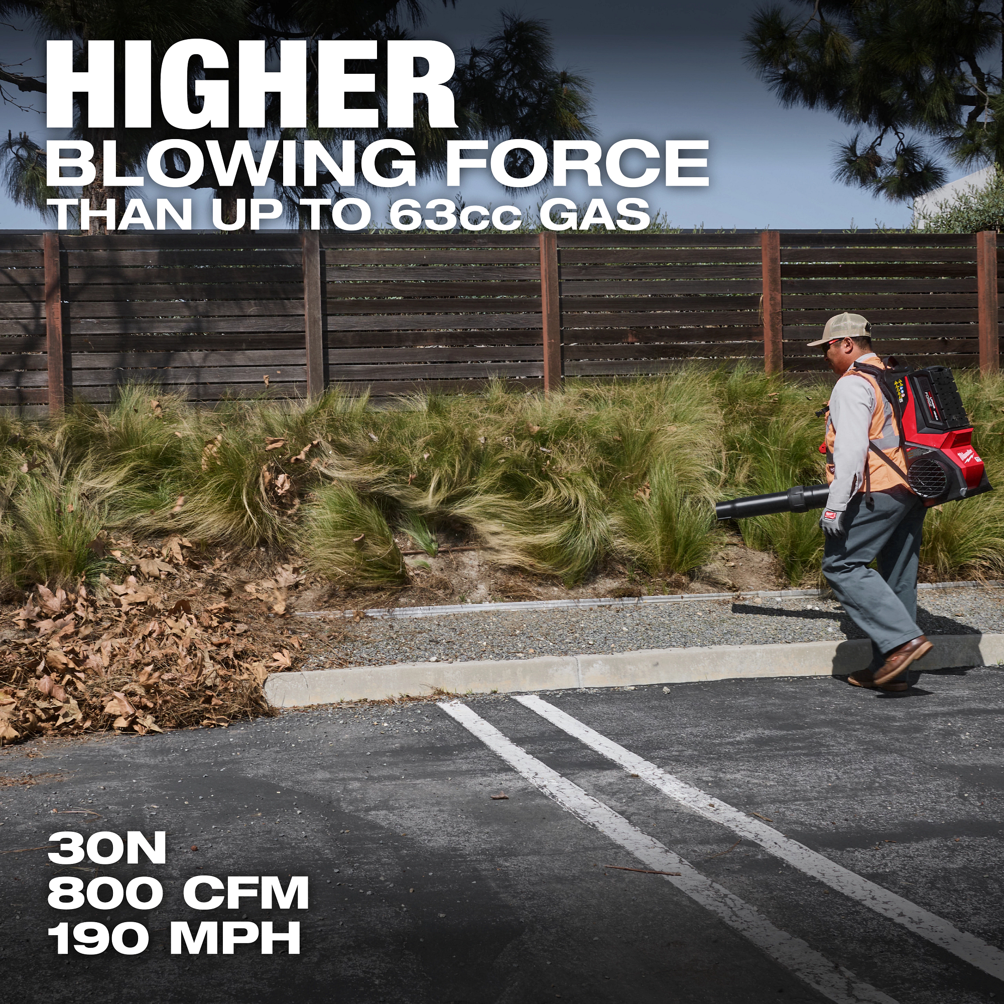 The MILWAUKEE® MX FUEL™ Backpack Blower Kit delivers higher blowing force than up to 63cc gas, providing users the power to clear heavier debris and more material faster. The POWERSTATE™ Brushless Motor delivers 800 CFM, 190 MPH, and 30 Newtons of blowing force in high mode while maintaining a sound level of 64dBA. This backpack blower features 3 power modes, allowing users to optimize performance and run time-based on application needs. Power modes can be selected by the operator on the tool or managed and locked remotely through the ONE-KEY™ app from a paired device, delivering the best performance control and increasing the work done. In addition to managing performance, the user can also utilize the ONE-KEY™ app to track usage and location, manage their blower inventory, and lock it out for security and protection of the user’s investment when needed. THE MX FUEL™ Backpack Blower delivers 20 to 45 minutes of constant power per charge when paired with an MX FUEL™ REDLITHIUM™ FORGE™ HD12.0 Battery (2 Batteries Included). The blower also offers a fully adjustable harness, telescoping nozzle, and adjustable handle position to adapt to the fit and comfort needs of different operators. The MX FUEL™ Backpack Blower is compatible with all MX FUEL™ REDLITHIUM™ batteries and is optimized for use with MX FUEL™ REDLITHIUM™ FORGE™ HD12.0 Battery Packs.