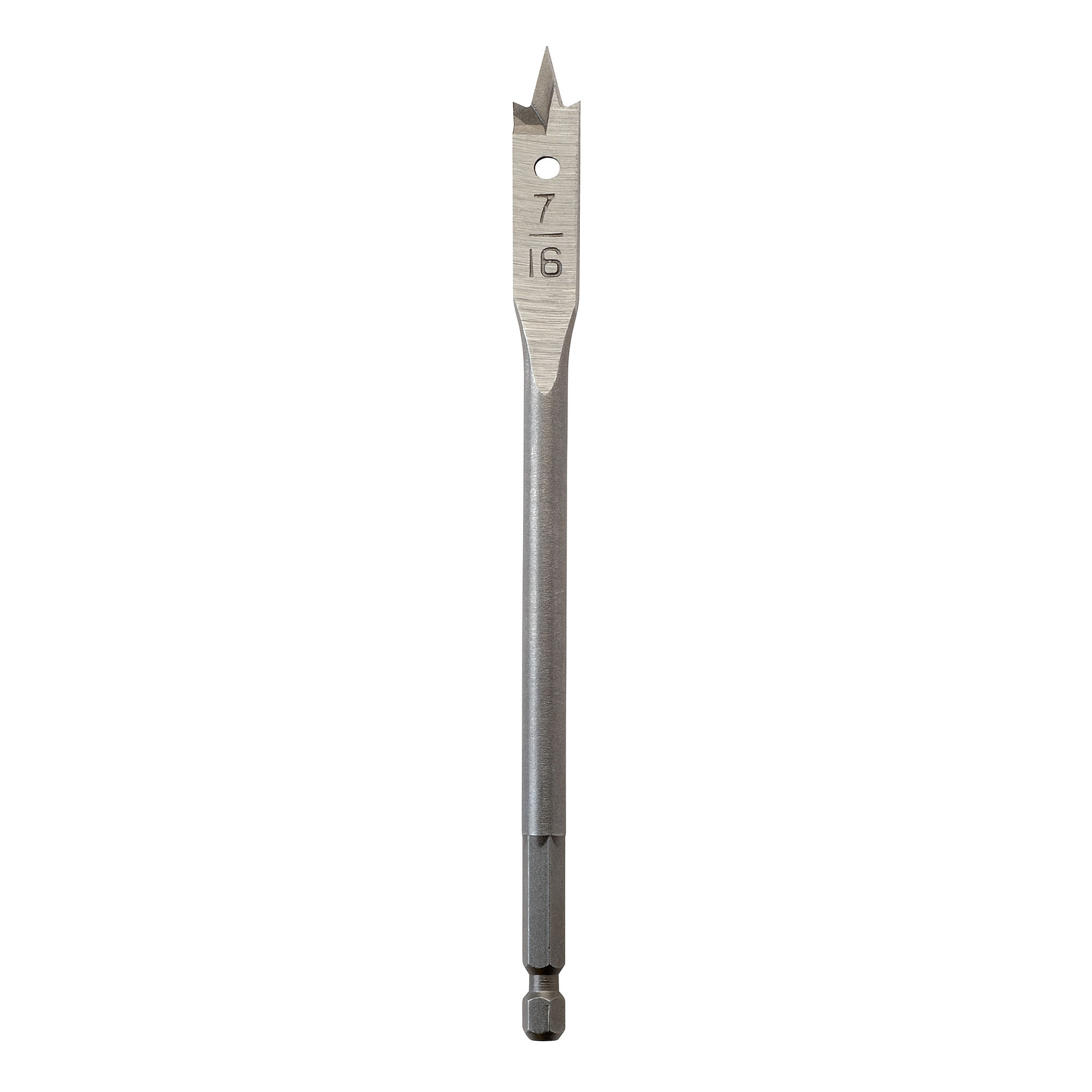 Bore small, clean holes at any angle in a variety of materials with the economical Milwaukee® 7/16 in. x 6 in. flat boring bit. This premium quality flat boring bit is made of heat-treated high carbon steel, so the drill point and cutting edge can be resharpened for cost savings and long life. Bore clean, fast holes at any angle in wood, plastic, plywood and Formica. This bit offers a 6 in. drilling depth but can be used with a 12 in. extension (48-28-3350) for extended deep-hole drilling. 3/16 in. shank diameter.