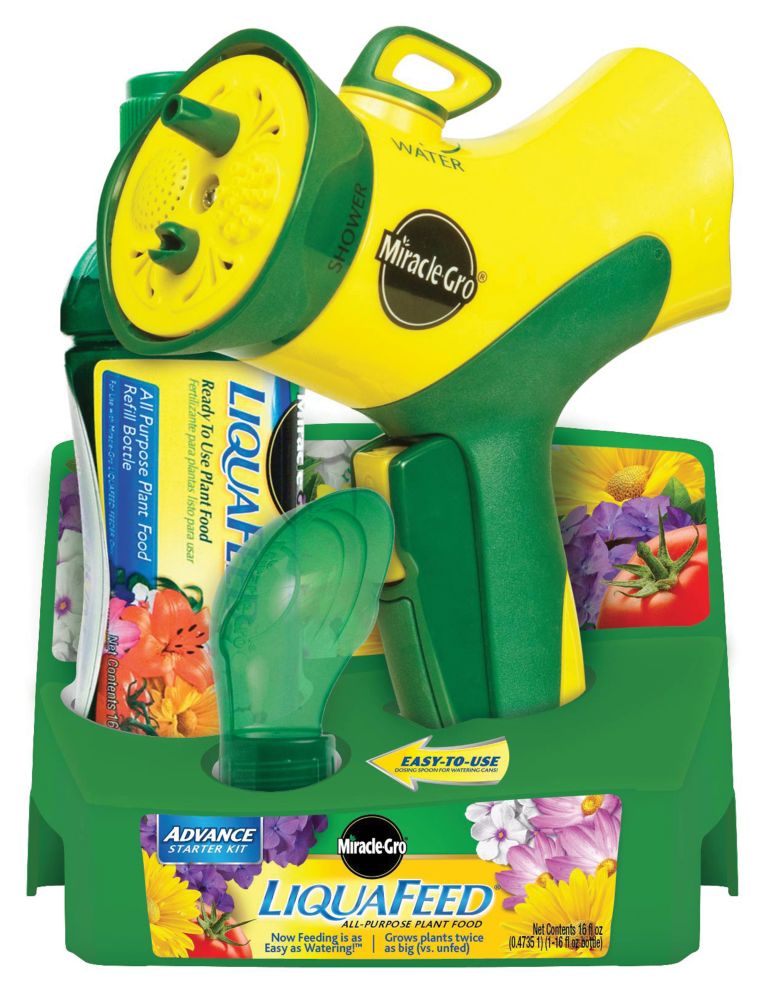 Keep your plants happily fed with Miracle-Gro LIQUAFEED ADVANCE Plant Feeding Starter Kit. This convenient bundle has everything you need to feed and water your garden all at the same time. Now Feeding is as Easy as Watering. This four-part kit includes: Miracle-Gro LiquaFeed Garden Feeder, Miracle-Gro LiquaFeed All Purpose Plant Food Concentrate 12-4-8, easy-to-use dosing spoon for watering cans, and reusable storage tray. Automatically mixes the right amount of plant food so you can feed and water at a consistent rate start to finish. For no-mix, no-measure feeding, just attach the feeder to a garden hose and insert the LiquaFeed refill bottle. Happy plants. Happy you.