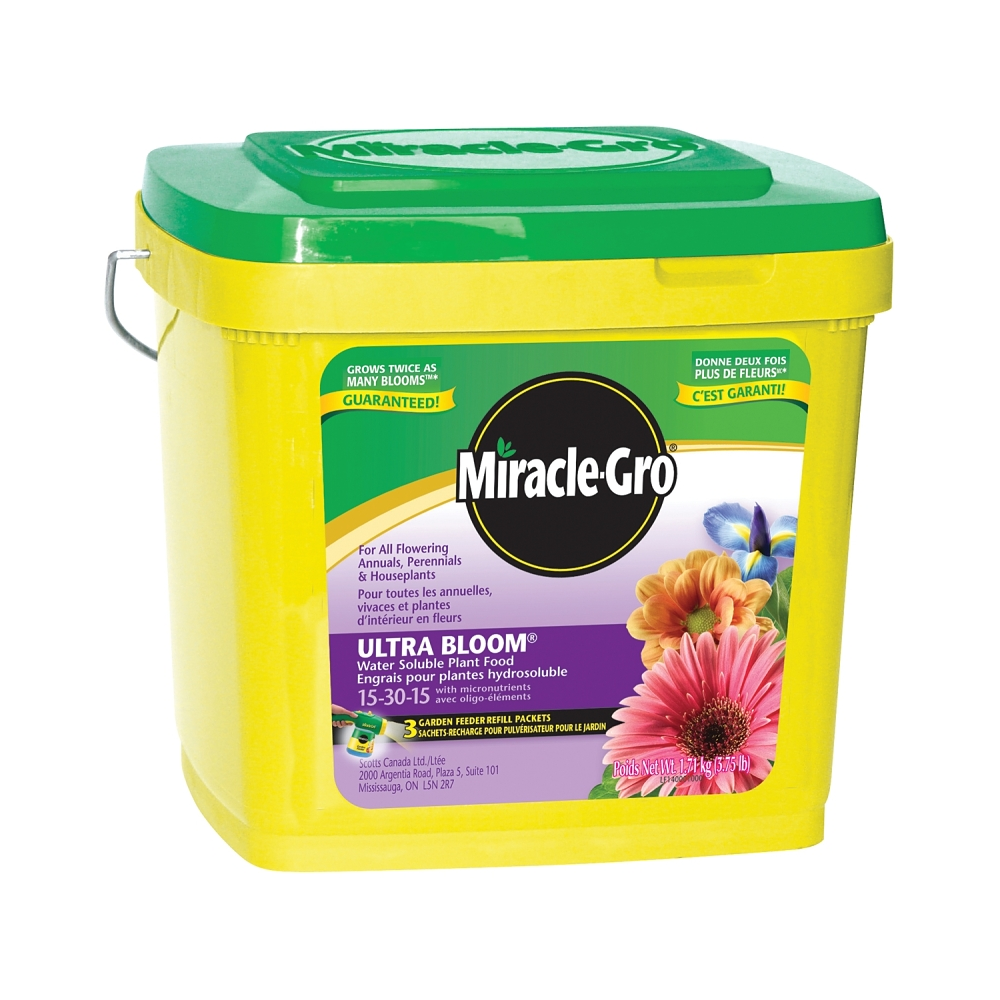 Miracle-Gro Plant Food, Net Content: 3.3 lb, Pail, Powder, N-P-K Ratio: 15-30-15, Ingredients: Ammonium Phosphate, Boric acid, Copper Sulfate, CuSO4, H3BO3, Iron EDTA, KCl, Manganese EDTA, Na2MoO4+2H2O, Potassium Chloride, Sodium Molybdate, Urea, Ureaphosphate, Zinc Sulfate, Density: 50 to 55 lb/cu-ft, Flammability Rating: 0, Blue