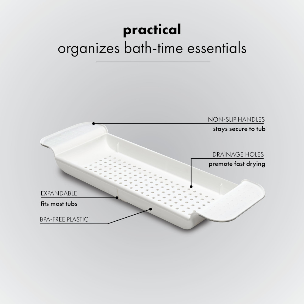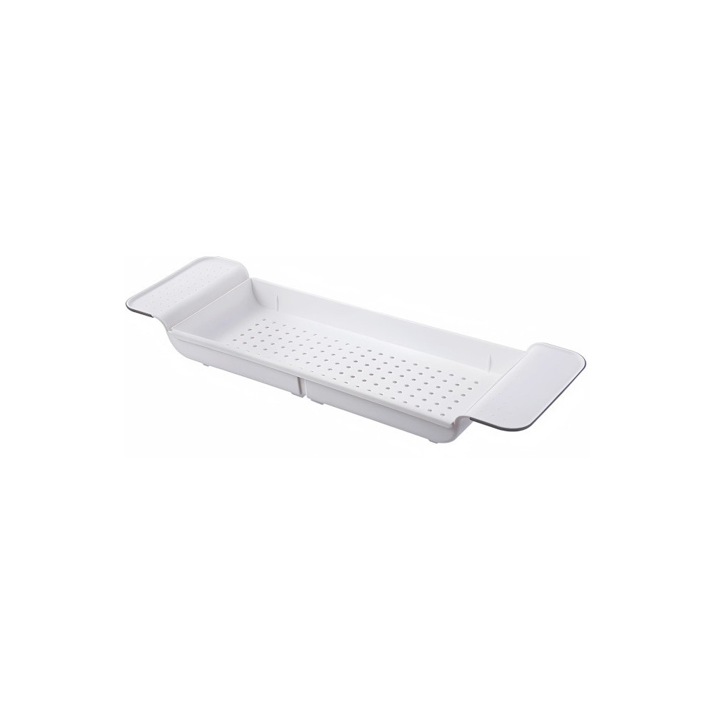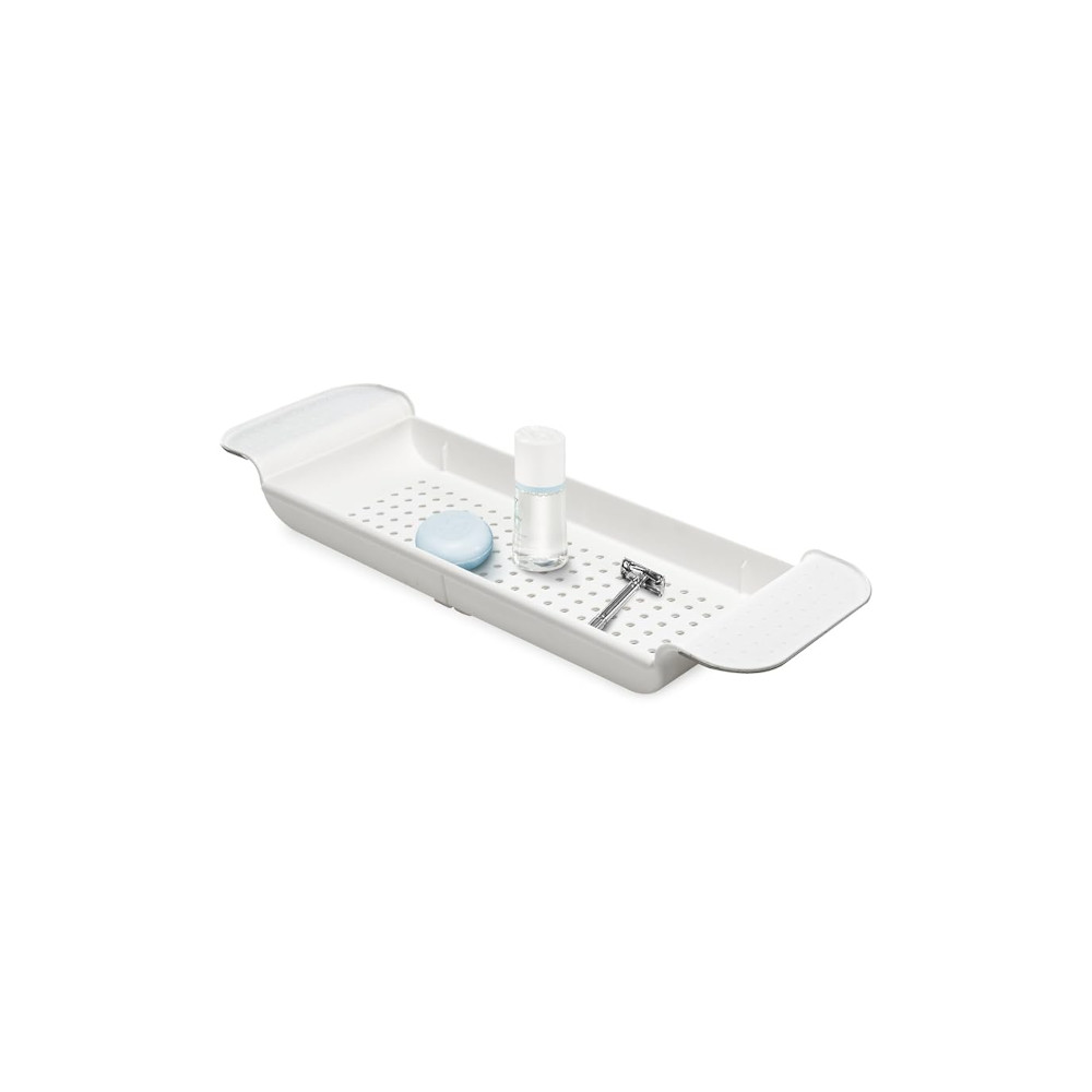 Immerse yourself in a world of practicality with our Bano expandable tub caddy in white. Carefully crafted from durable plastic, this caddy seamlessly merges elegance and resilience. Effortlessly installed, it smoothly adjusts to accommodate tubs ranging from 22 in. to 31 in. in width. With its rust and water-resistant features, it guarantees enduring durability while providing a chic storage solution.
