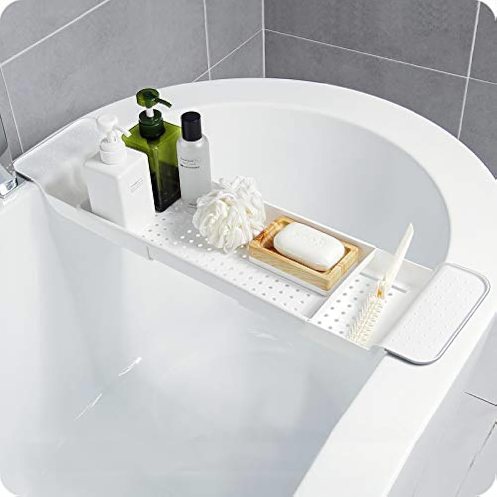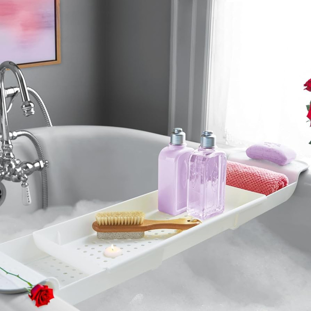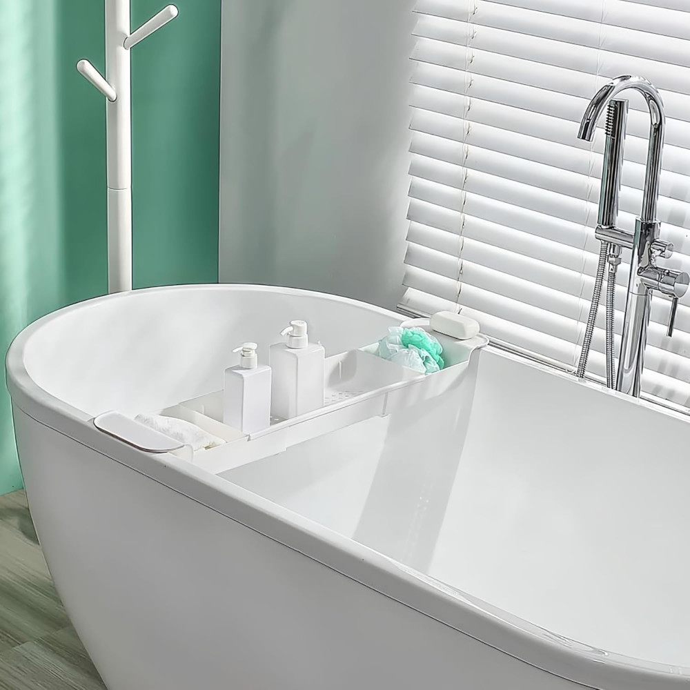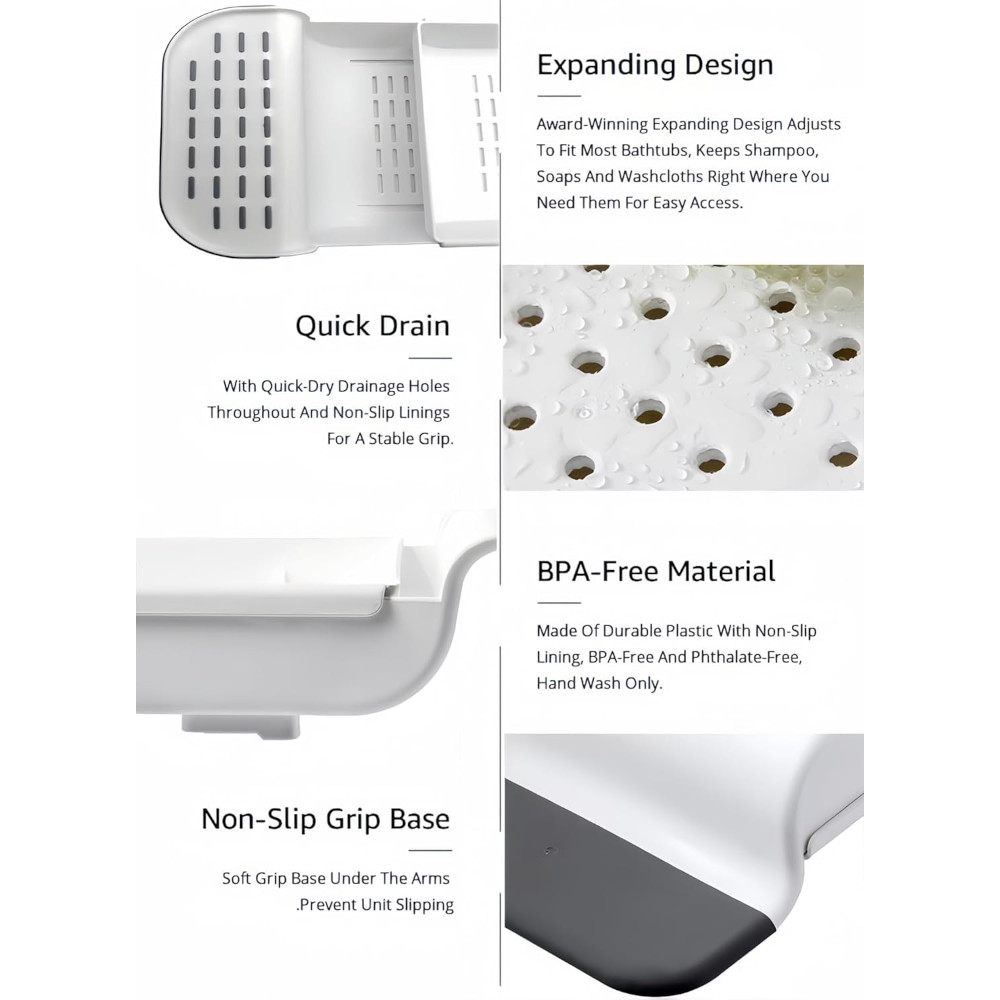 Immerse yourself in a world of practicality with our Bano expandable tub caddy in white. Carefully crafted from durable plastic, this caddy seamlessly merges elegance and resilience. Effortlessly installed, it smoothly adjusts to accommodate tubs ranging from 22 in. to 31 in. in width. With its rust and water-resistant features, it guarantees enduring durability while providing a chic storage solution.