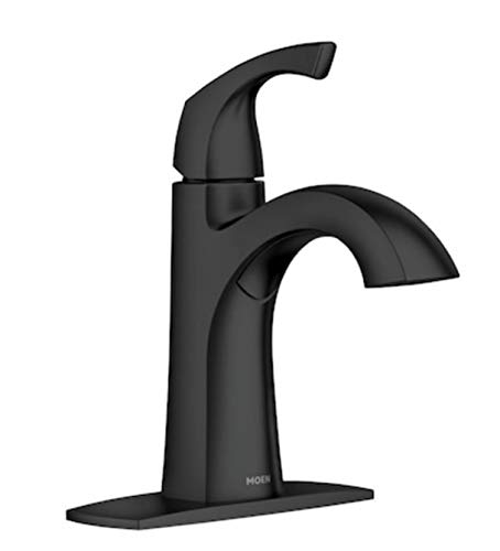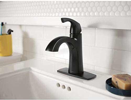 Elegantly simple the Lindor collection s graceful curves and contours flow as beautifully as the faucet s water stream creating a Transitional style that spans a variety of decorating trends. Brand Name: Moen Sub Brand: Lindor Finish: Matte Black Motion Sensing: No Product Type: Bathroom Faucet On Center Measurement: 4 in. Flow Rate: 1.2 gpm Number of Installation Holes Required: 1 or 3 Number of Handles: 1 Spout Height: 5 in. Connection Size: 3/8 in. Handle Type: Lever ADA Compliant: Yes Spout Reach: 4.8 in. Spout Type: High Arc Style or Series: Modern Drain Assembly: Spring Loaded Pop-Up Application: One Or Three Hole Supply Line Length: 32 in. Connection Type: Compression.