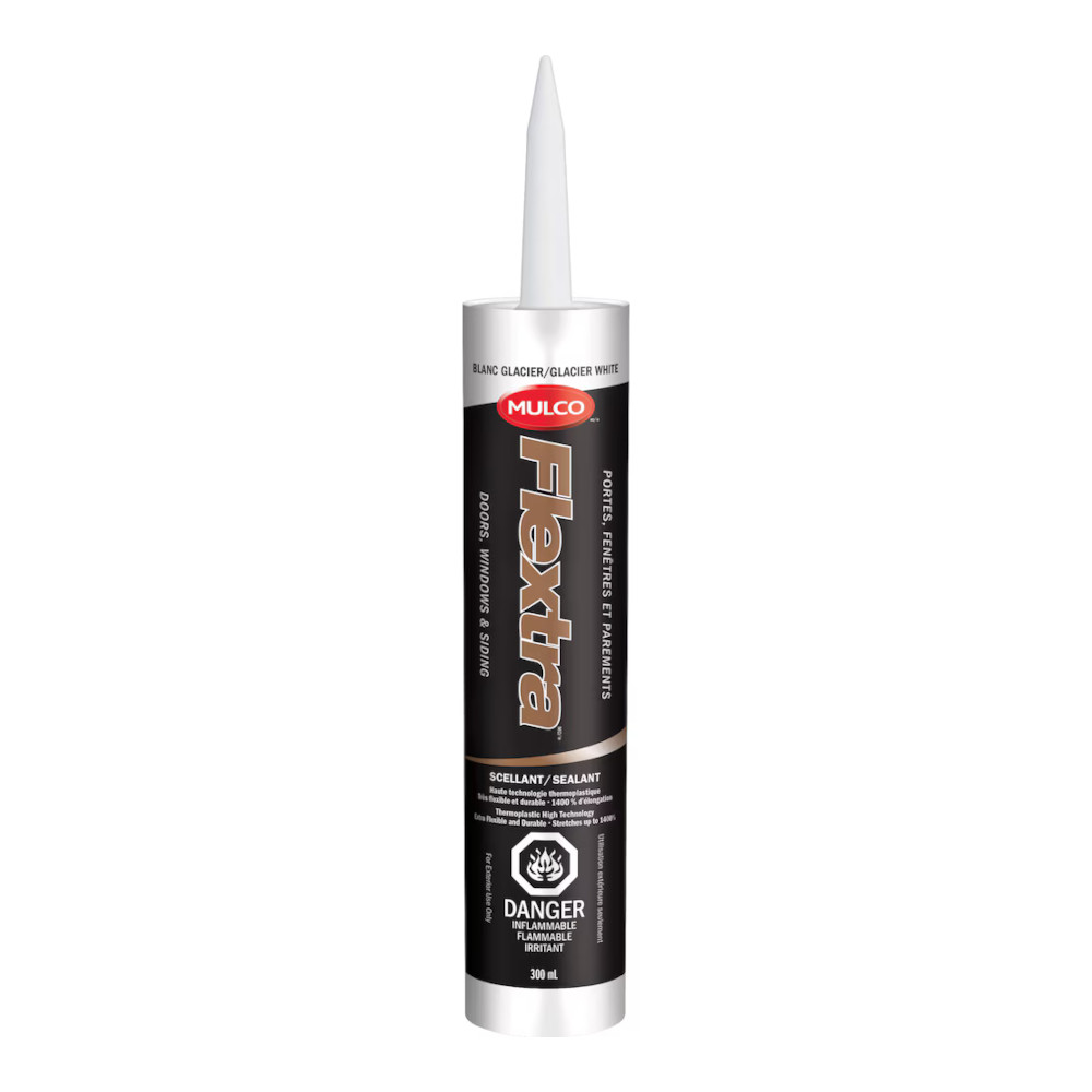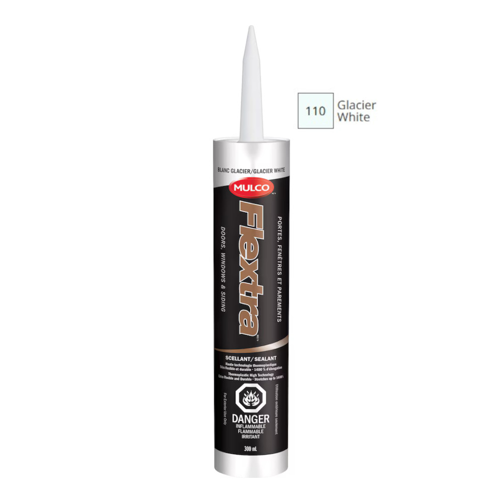 Mulco Flextra Thermoplastic Sealant, Net Content: 300 mL, Cartridge, Odor/Scent: Hydrocarbon, Glacier White, Compositions: Ethylbenzene, Proprietary Fragrance, Titanium Dioxide, Toluene, White Mineral Oil (Petroleum), Xylene, Specific Gravity: 0.98, Density: 8.18 lb/gal, Application Temperature: -30 to 40 deg C, 31 ft Coverage Area, Indoor/Outdoor: Outdoor, Resists: Atmospheric Contamination, Pollution, Ozone, Rain, Snow, Sunlight, Ultraviolet Radiation, Application Method: Caulking Gun, Applicable Materials: Anodized Aluminum, Fiberglass, Galvanized Steel, Glass, Masonry, Metal, Natural, Steel, Vinyl, Wood