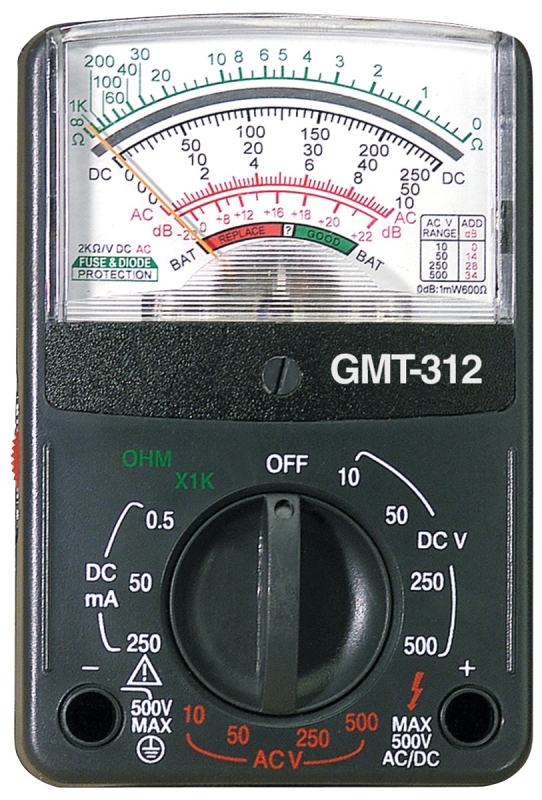 GB GMT-312 Multimeter, Analog Display, Functions: AC Voltage, Continuity, DC Current, DC Voltage, Resistance, Black