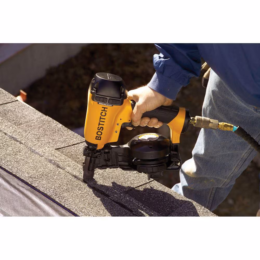 The Bostitch Coil Roofing Nailer features aluminum housing for jobsite durability and a single action canister for fast, one-step nail loading. Rubber housing pads help keep the nailer from sliding off roof, and a hardened nose with carbide inserts resists wear. Also features a rubber grip for added comfort and temperature protection. A shingle gauge helps quickly space shingles, while the adjustable deflector conveniently directs the exhaust. Available in contact or sequential trip. Driving power of 442 In. lb. Power to weight ratio: 74.