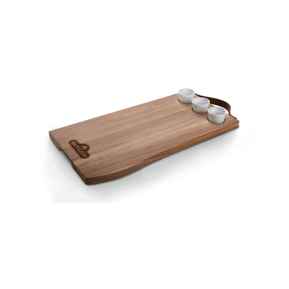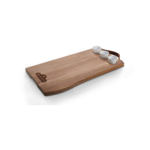 Made from genuine Acacia hardwood, this Charcuterie Board is large and stylish, perfect for serving delectable charcuterie to a crowd. This set includes three ceramic serving ramekins for olives, dips, and anything else you can imagine. The naturally occurring oils provide resistance to liquid as well as resistance to fungi and microbes. The warm and rich grain comes in deep reds, golden yellows, and even purples making each board a unique piece. Easy to maintain, we recommend hand washing the board as needed, and not soaking. Use the beautiful, genuine leather handle to bring your board where it’s needed or use it for stylish storage.