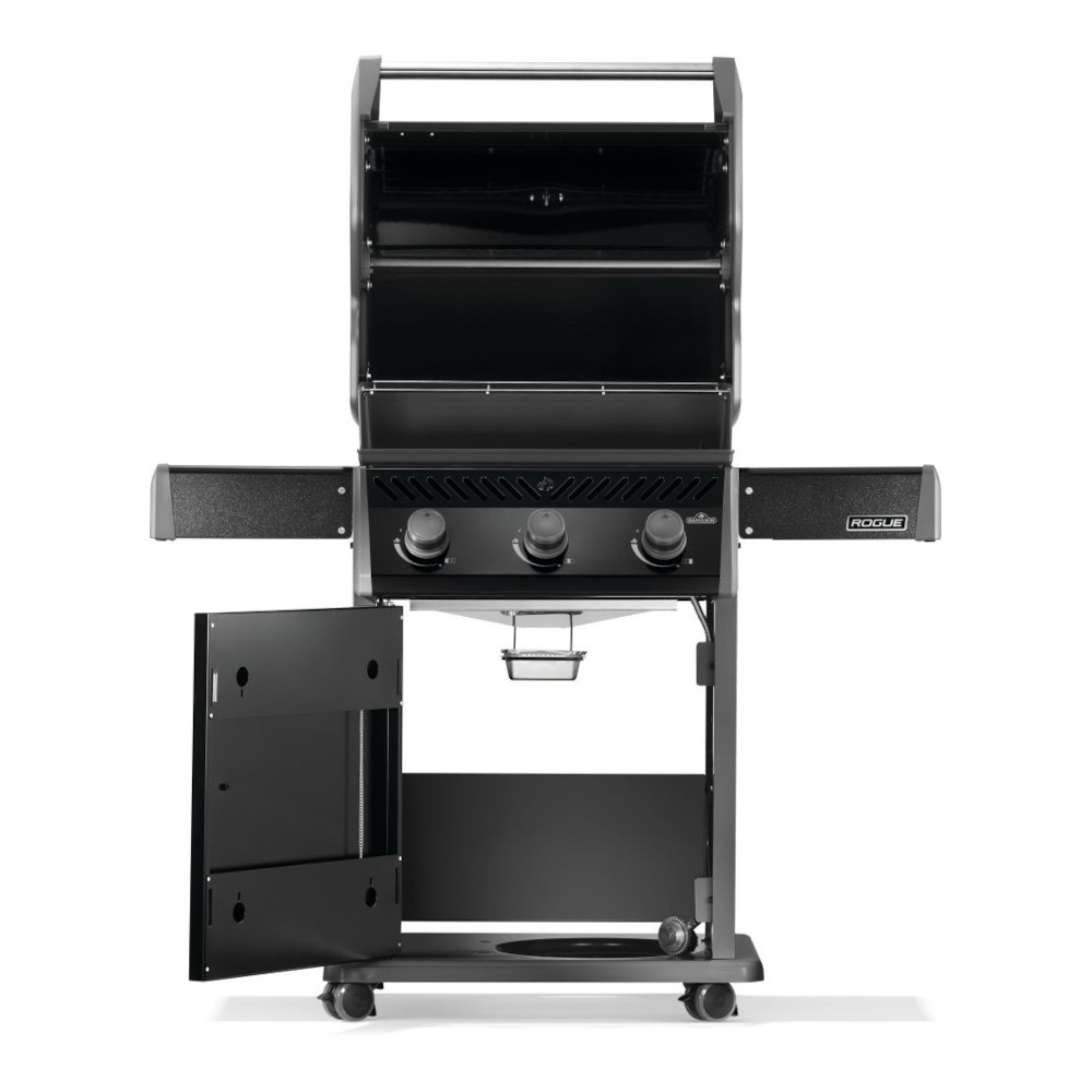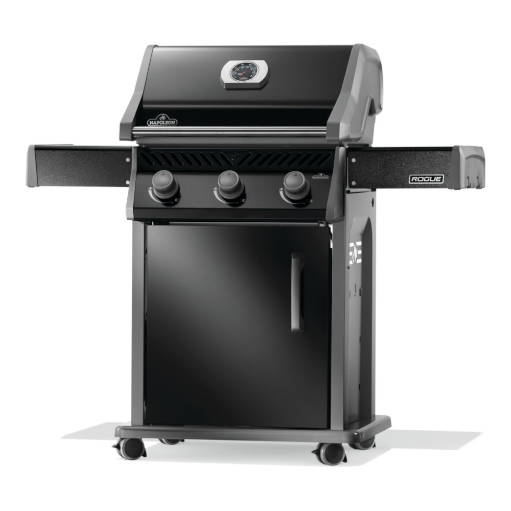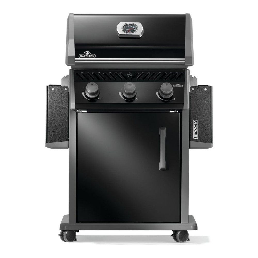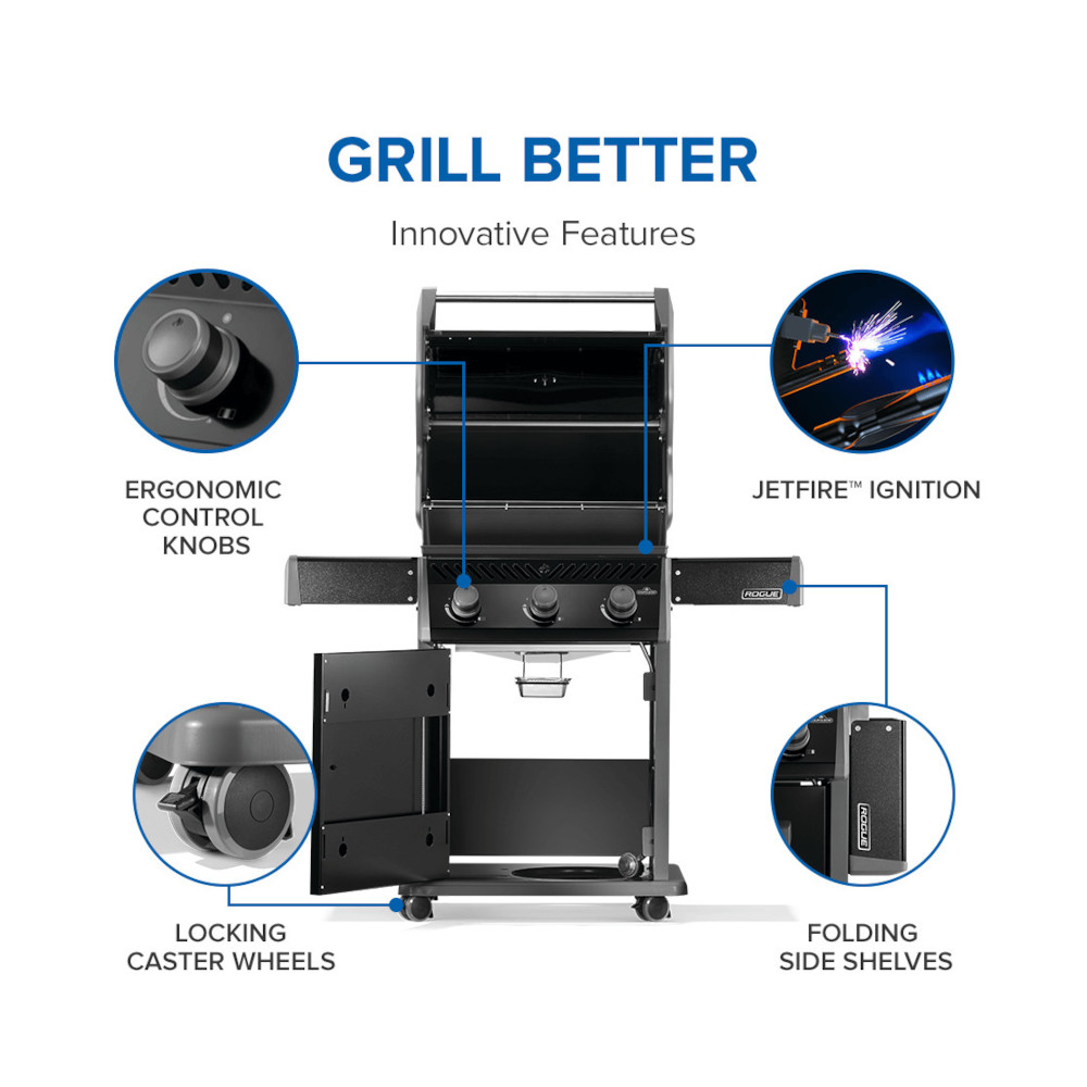 Napoleon Rogue 425 Gas Grill—perfect searing, battery-free ignition, locking casters, and versatile storage for exceptional grilling in any space!
