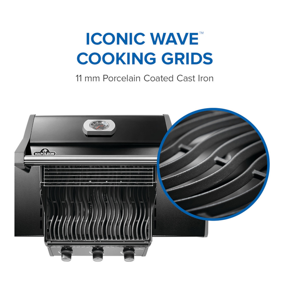 • WAVE SHAPED GRATES: The iconic WAVE™ shaped cooking grids provide even heating, prevents food from falling through, and produces exceptional sear marks