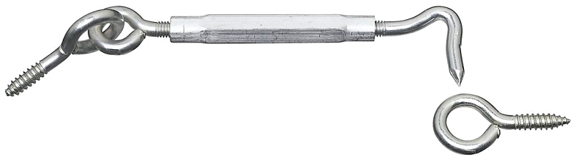 Designed for heavy warehouse, grain bin, machine shed doors and more. After a door is closed and hooked, it can be drawn tightly shut by rotating turnbuckle. Hex-shaped body allows for ease of adjustment by hand or with a wrench. Prevents door rattling. Hook and eye are made of steel.
