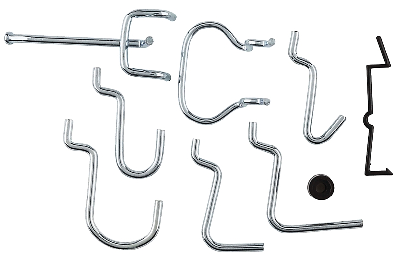 Assortment kit for organizing a variety of tools and items on pegboard. Easy, self-installation. For 1/8 in and 1/4 in pegboard. Visual-pack.