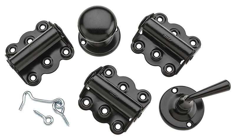 Includes 3 Spring hinges, 1 Door pull, 1 Door knob, 1 Hook and eye latch, Mounting screws. Designed for full surface applications. Non-removable pin hinges are with the enclosed spring for left or right mount applications. Complete kit for vinyl or wood screen doors. Knob and lever are non-operative. Visual pack.