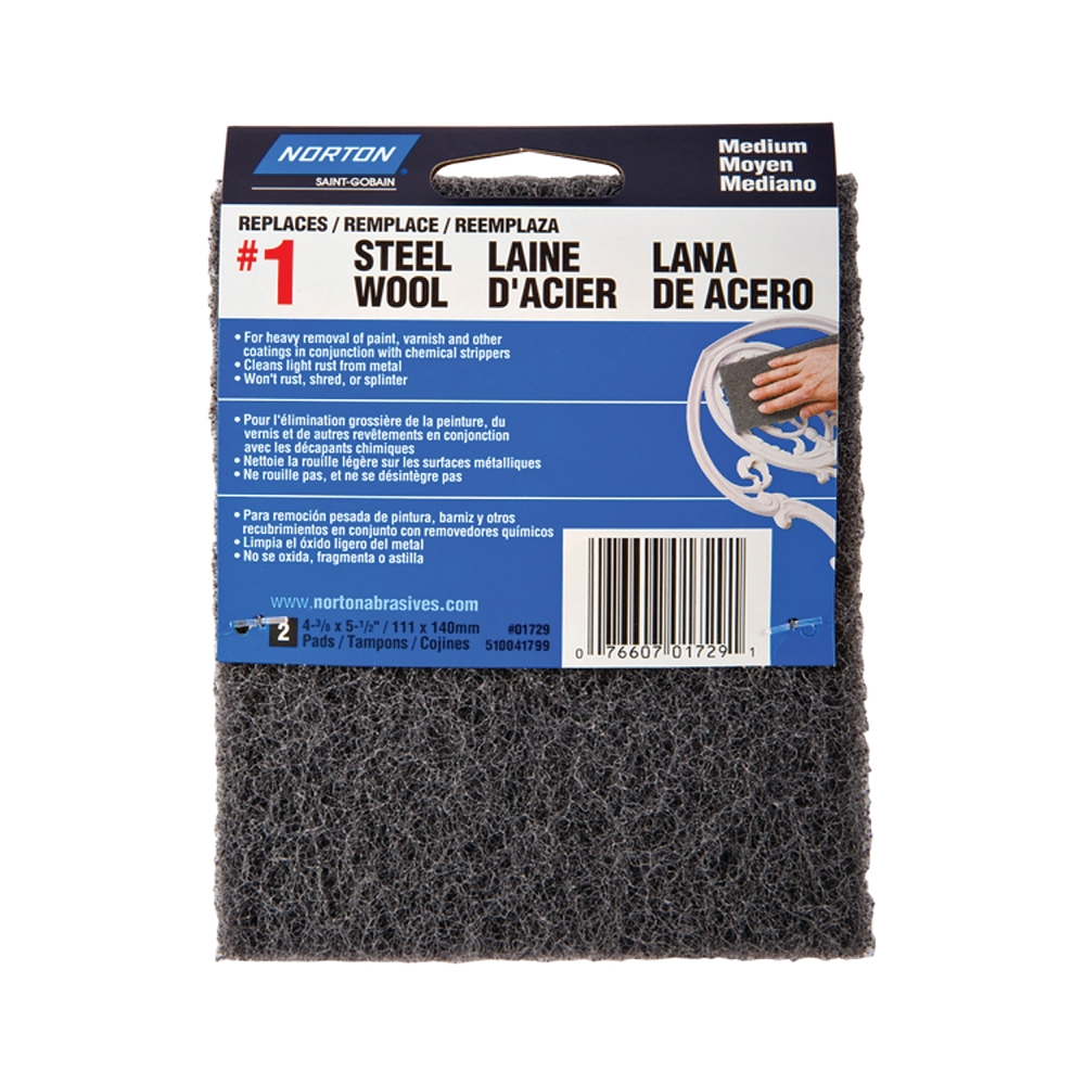 Norton 01729 4-3/8" x 5-1/2" #1 Grit Medium Steel Wool, 2 Pack – Charcoal