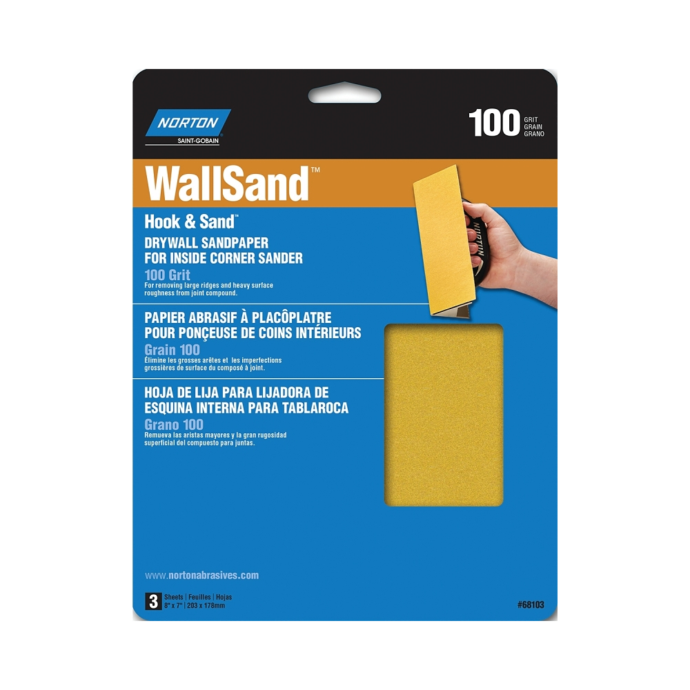 Norton 68103 8" x 7" 100 Grit Medium Corner Sandpaper, 3 Pack
