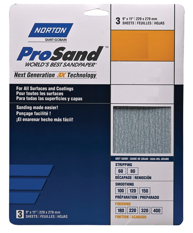With a water-based, non-pigmented stearate coating that offers an open coat with excellent resistance to loading and clogging, this ProSand A259PS fine grit paper sheet is made without color dye to prevent color transfer. The premium, heat-treated abrasive cuts faster and lasts longer than 3X technology and the latex saturation, fiber reinforcement and increased weight offer tear resistance and grain retention while still being flexible enough to fold. Use this sandpaper to finish and prepare the surfaces of hard and soft carbon steels, soft metals, titanium, super alloys, hard and softwoods, fiberglass and composites.