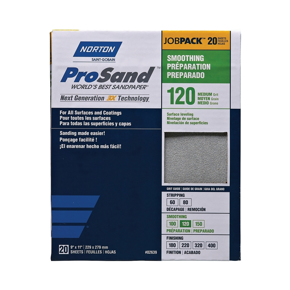 Sand super alloys, metals, woods and fiberglass composites with the ProSand A259PS medium grit paper sheet and enjoy an excellent cut rate and long-lasting durability. The sheet is crafted with a heat treated abrasive affixed to a fiber reinforced backing that maintains flexibility while ensuring excellent grain retention. An open coat, non-pigmented, water based stearate coating prevents color transfer and produces minimal loading. An ideal product for moderate material removal and finishing, this versatile sandpaper delivers great results with a sanding block or board or when used for hand sanding projects.