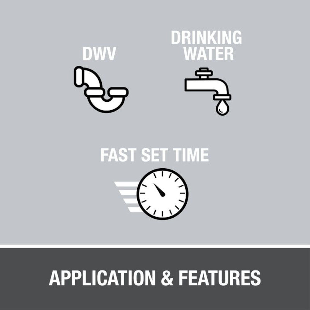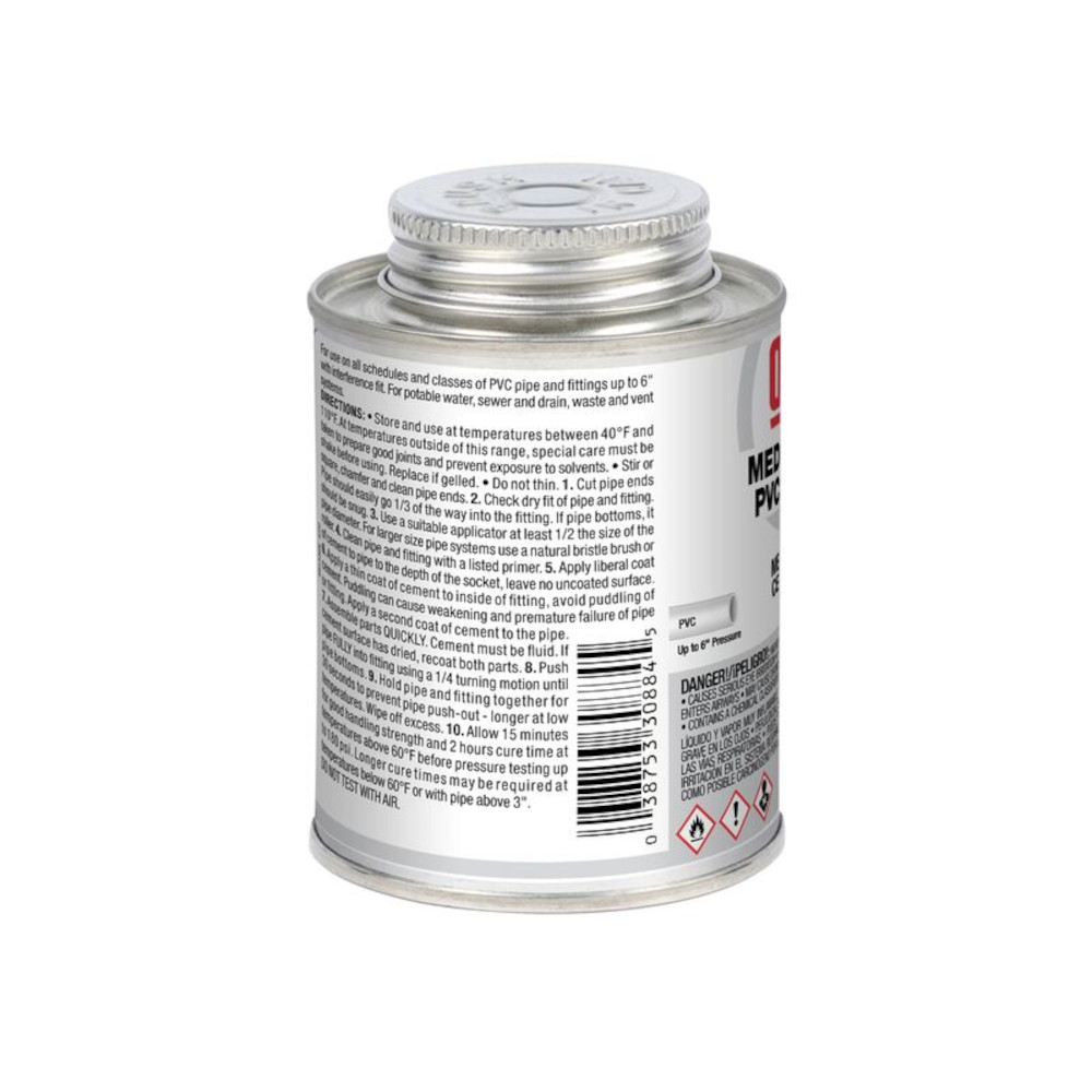 Oatey® PVC Medium Gray Fast Set Cement is recommended for DWV, pressure pipe, potable water and electrical applications. Its medium body has excellent gap filling properties and is easy to apply with included in-lid dauber. This gray, fast set cement can be used to solvent weld all schedules and classes of PVC pipe and fittings up to 6 in. diameter with interference fit. Oatey products have earned the trust of plumbing professionals for over 100 years.