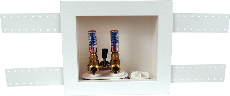 Oatey QUADTRO® washing machine outlet boxes shall be used in commercial or residential applications which require supply valves and waste drains recessed into the wall. Available water hammer arrestor option provides water pressure shock arrestors required for installation on supply lines to quick closing valves. Easy to remove knockout.