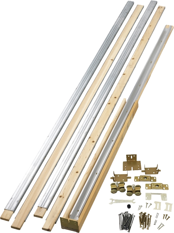 Onward Pocket Door Frame and Hardware Kit, Maximum Door Width: 36 in, Track Length: 72 in, Maximum Weight per Door: 150 lb, Door Thickness: 1-3/8 to 1-3/4 in, Mill, Screw Mounting, Includes: (2) Brackets, (1) Bumper Door Stop, (2) Door Guide Sets, (2) Door Plates, (2) #8 x 1 in Flat Head Screws, (2) #8 x 3/4 in Flat Head Screws, (2) Floor Brackets, (1) Header and Track Assembly, (2) Hangers, (4) Jamb Stiffeners, (12) #8 x 1-1/2 in Pan Head Screws, (3) #8 x 5/8 in Pan Head Screws, (18) 2 in Nails, (18) 3/4 in Nails, (1) Wrench, (2) Roller Carriers with 4 Ball Bearings