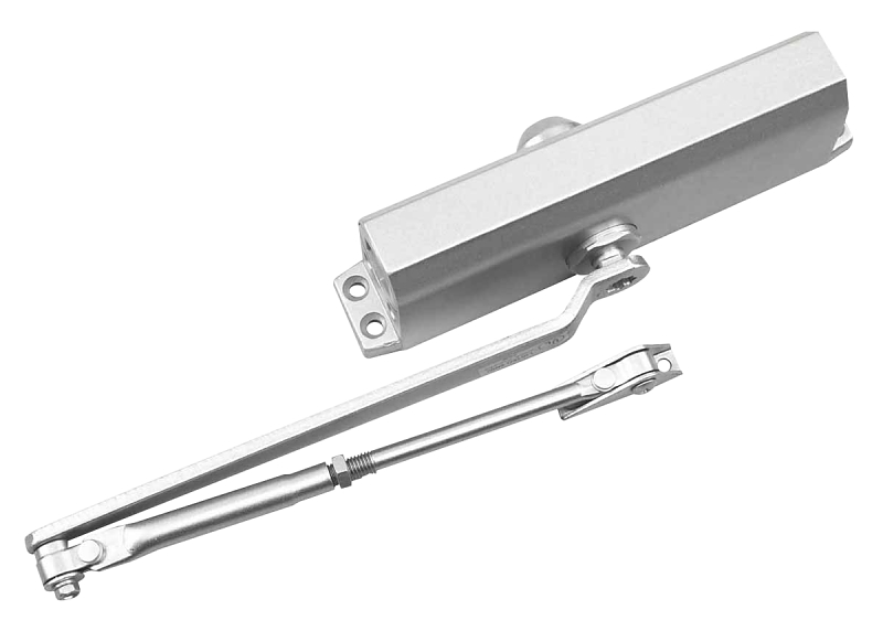 Onward 1600 Door Closer, 80 to 100 kg Weight, Projection Size: 72-1/2 in, Hand Orientation: Left, Right, Mounting Hole Distance: 19 mm Vertical, 230 mm Horizontal, Aluminum, Satin, Housing Length: 9-1/16 in, 2.8281 in W, Includes: Nail, Screws