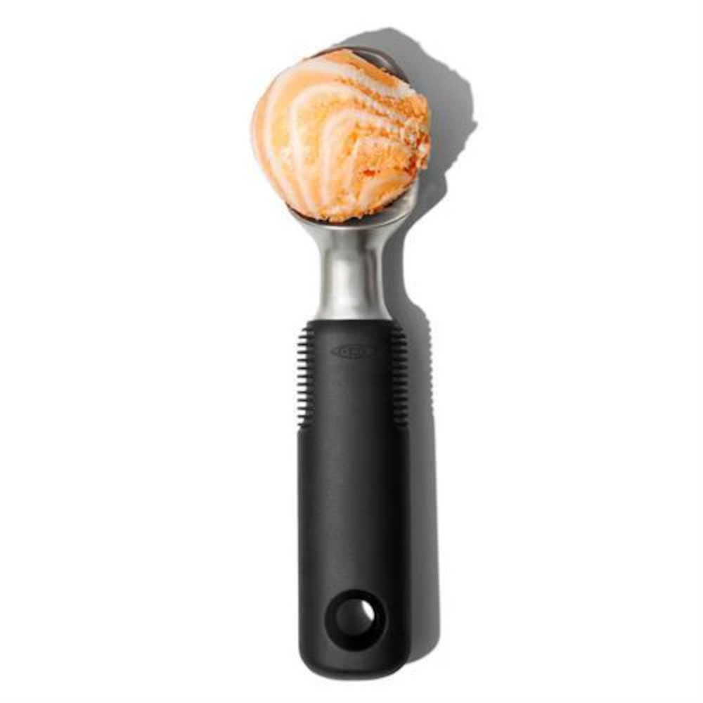 Quickly serve up the flavor of the day with this OXO Good Grips stainless steel ice cream scoop! With its round shape, this scoop easily glides through even hard-packed ice cream, frozen yogurt, or sorbet so that you can keep the line moving at your ice cream shop. Better yet, you can maximize your profits by using it to reach into the corners of your ice cream tub to ensure no product is left behind! Enjoy your frozen foods with no fuss.