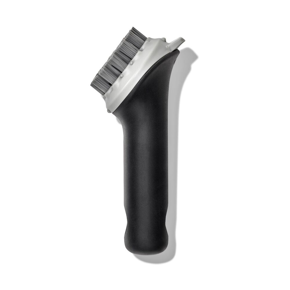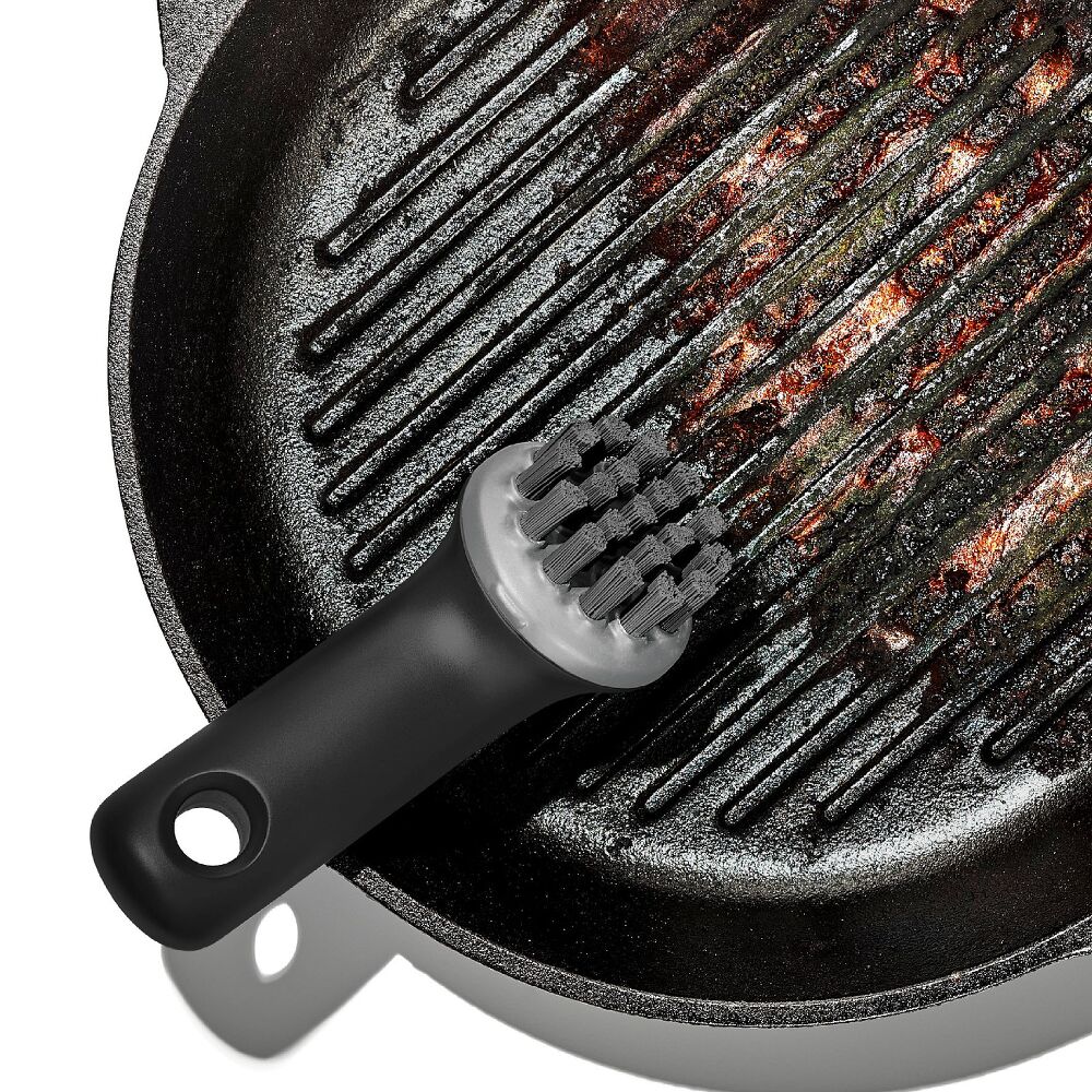 A thoughtfully designed bristle pattern tackles both flat and ridged cookware, while angled bristles provide extra leverage to reach into grooves and corners. A durable built-in scraper helps remove stubborn, greasy residue, and the compact, non-slip handle ensures a comfortable, secure grip.