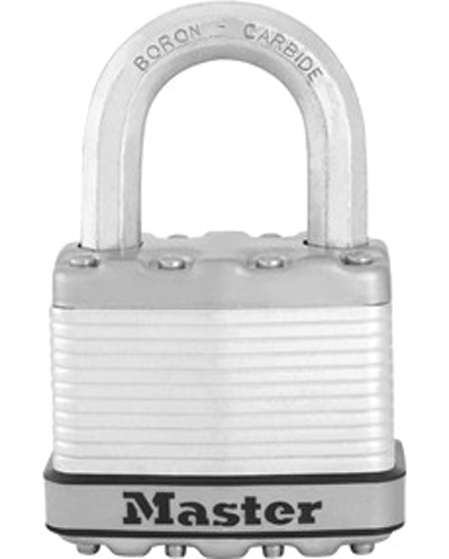 The Master Lock Magnum® M5XD laminated padlock features a 2 in (51 mm) wide laminated steel body for maximum strength and reliability and is surrounded by stainless steel and zinc outer components for weather resistance. The 3/8 in (10 mm) Dia octagonal shackle is 1 in (25 mm) long and made of Tough-Cut™ boron-carbide, 50% harder than hardened steel, offering maximum resistance to cutting and sawing. The four pin cylinder prevents picking and the dual locking ball bearings provide maximum resistance against prying and hammering. The lifetime guarantee provides peace of mind from a brand you can trust.