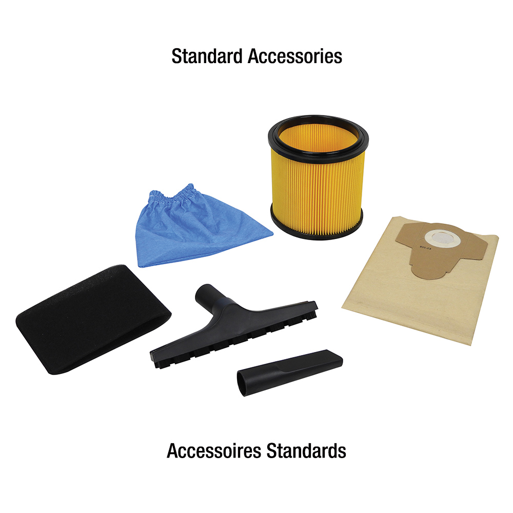 • Comes complete with 6 ft. x 1-1/4″ thread-on hose, 2 pc. plastic extension wand, 30L dust bag, cartridge filter, foam filter, re-usable filter, 10” floor sweep and crevice tool
