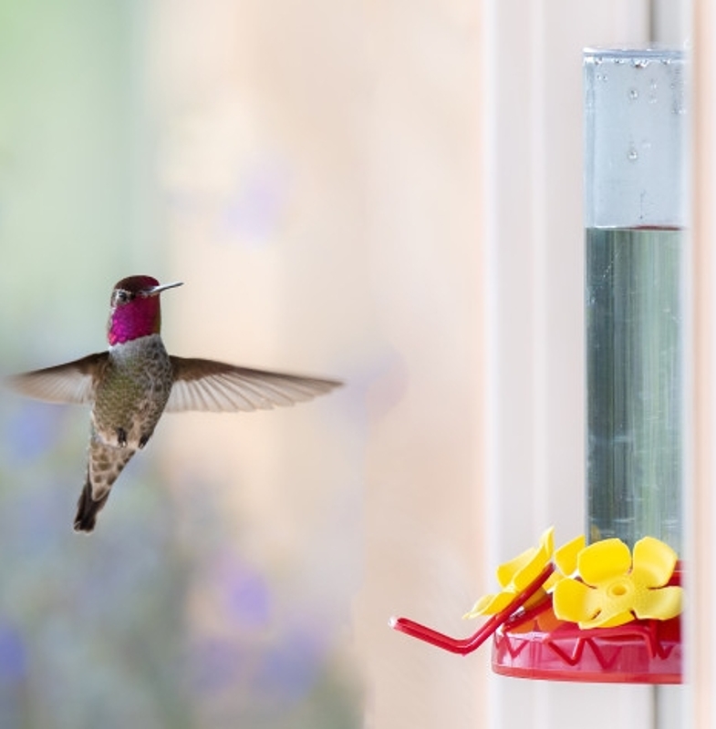 Feeder holds up to 8 oz of nectar, has a transparent, plastic reservoir and bright-red plastic parts that will capture the attention of hummingbirds. A rounded, gently sloped base comes equipped with 3 flower-shaped feeding ports and 3 detachable perches to provide hummingbirds with a comfortable place to perch.