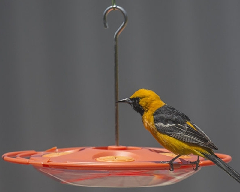 Enjoy hours of watching the delightful orioles as they feast at one of these bright orange plastic oriole bird feeders. The Perky-Pet® Tray Oriole Feeder has a 16 oz nectar capacity, 4 perches, a no-drip design, a built-in ant moat and a patented bee guard to keep bees out while birds feed. Oriole bird feeders may be hung or pole mounted. Place up to four orange slices on top of tray in designated slice holders to increase your chances of drawing orioles to your backyard.