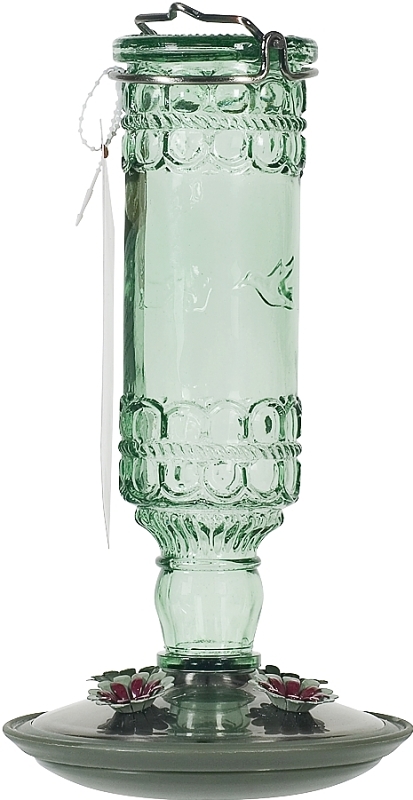The Perky-Pet® antique bottle hummingbird feeder holds 10 oz of nectar and features a sea-green glass bottle with brushed silver accents. In addition, the feeder features four decorative flower feeding ports surrounding its base.