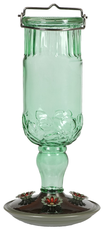 The Perky-Pet® green antique bottle hummingbird feeder will bring a classic touch to your yard and provide your tiny feathered friends with a tasty treat! This large capacity feeder holds 24 oz of nectar to ensure that there will be plenty of nectar to go around! The metal base has for flower feeding ports with brushed silver accents. Cleaning is simple with the removable base and hanging is a breeze with the attached metal hanger.