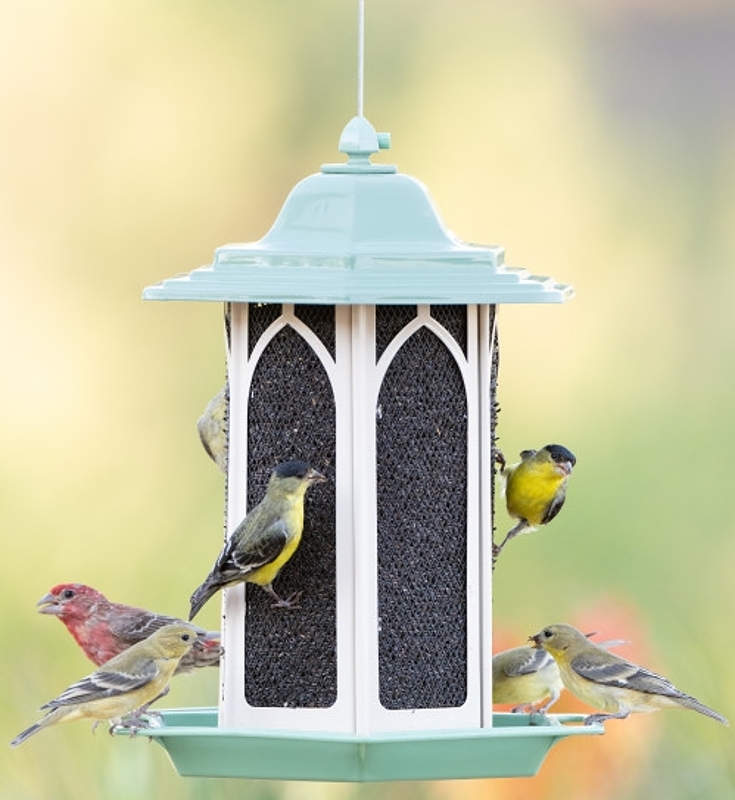 Make your backyard the go-to hangout spot for wild birds with the Perky-Pet® pistachio green gazebo feeder. This feeder boasts a wrap around seed tray that allows birds to perch anywhere around the feeder. With the ability to hold up to 3.5 lb of mixed seed, your favorite backyard birds won’t be able to resist flocking to your yard. In addition to offering features birds love, this feeder also makes a charming addition to any outdoor setting with its quaint gazebo-style design. The powder-coated finish prevents rust to ensure it will be a focal point for years to come.