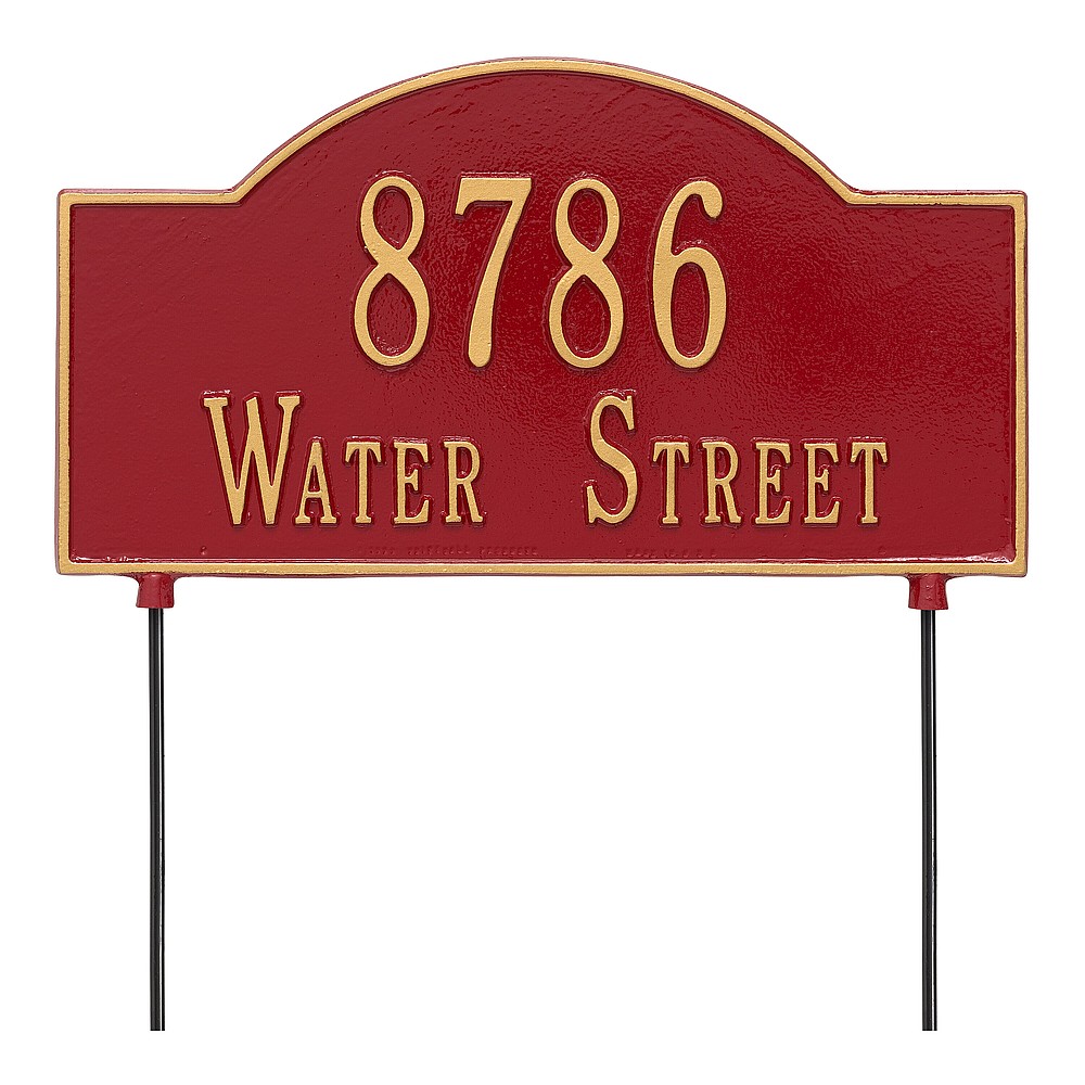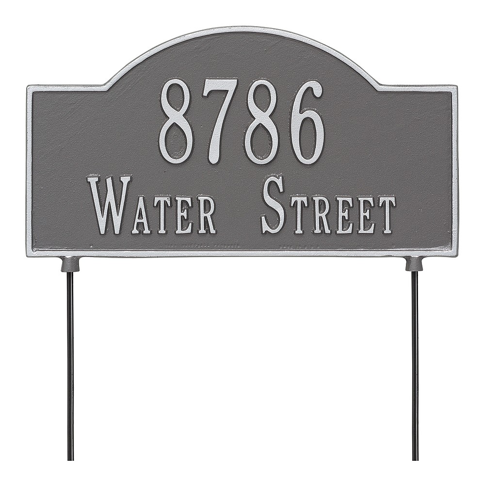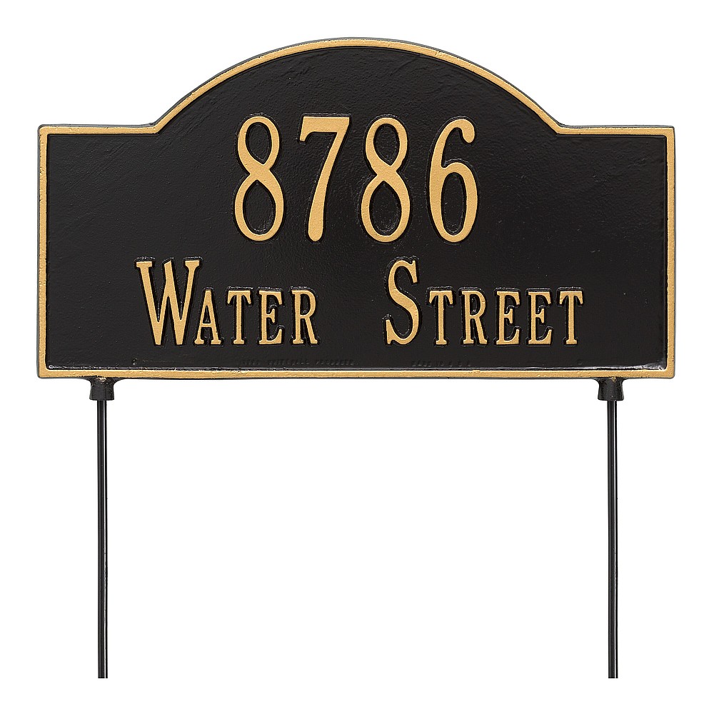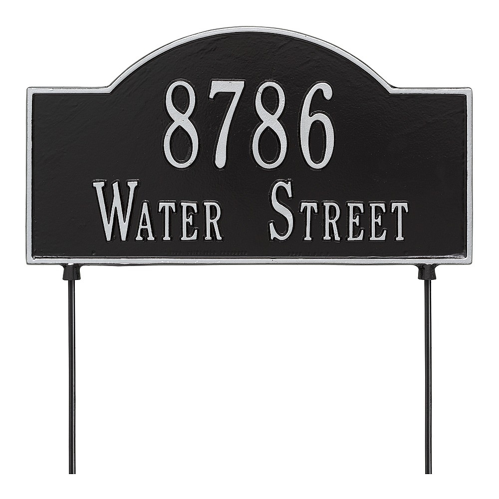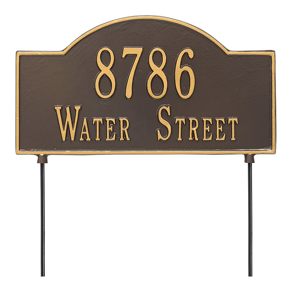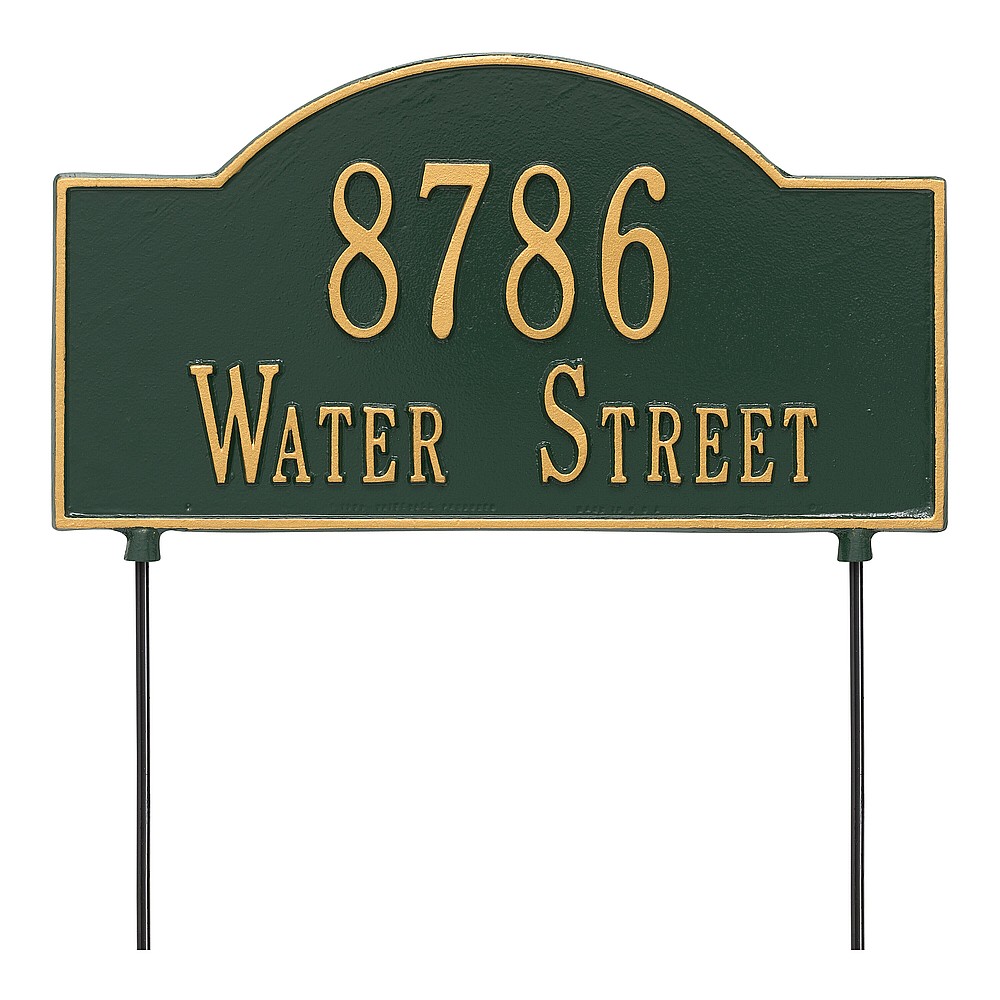 Dimensions (L x W x H): 15.75 x 9.25 x .375 The 2-Sided Arch personalized lawn plaque is a great way to add instant curb appeal. With the ability to cast on both sides, this plaque offers great versatility and visibility. Every Whitehall plaque is proudly hand crafted in the USA. Personalization is permanently cast into the sign. Manufactured from cast, high-density aluminum alloy and protected by our exclusive Alumi-Shield all weather coatings. Alumi-Shield All Weather Coating: A Whitehall Exclusive Alumi-Shield – Protects against the harshest weather and environmental elements. Extends the product life and maintains the look and function. Made in the USA.