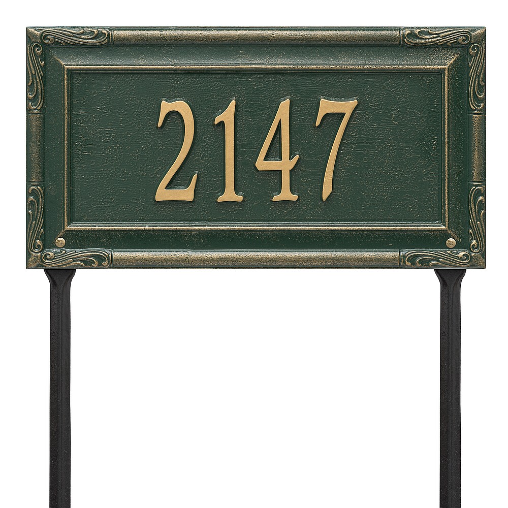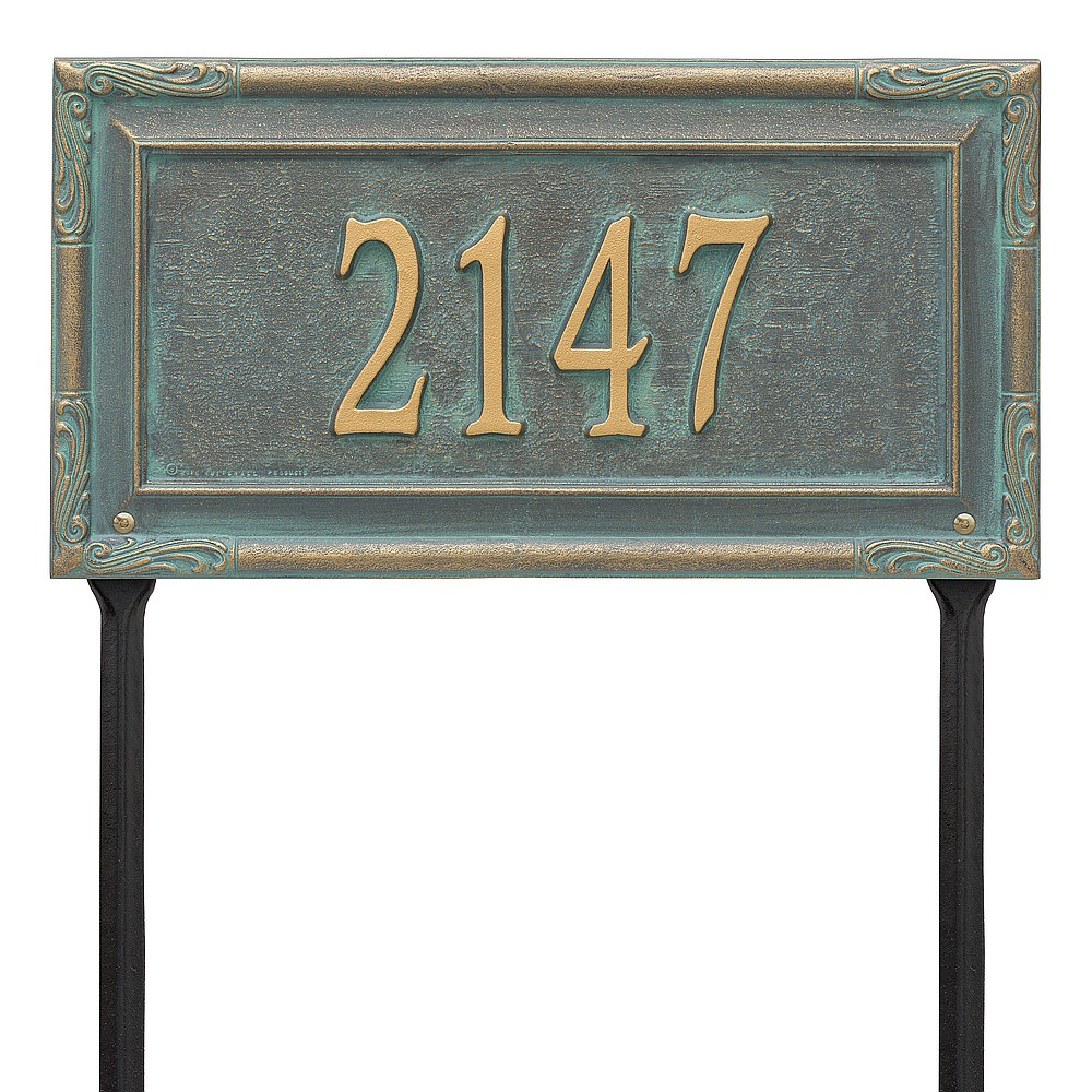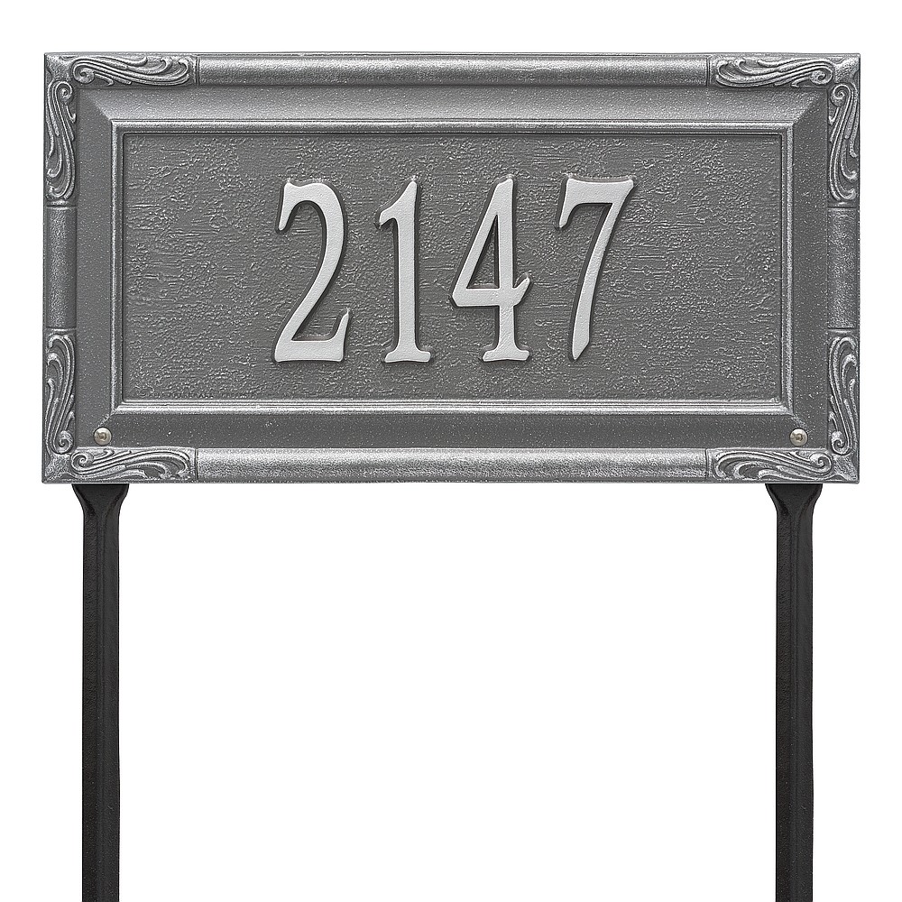Dimensions (L x W x H): 18 x 9.5 x .375 The Whitehall Gardengate personalized plaque adds instant curb appeal to your home address numbers. The Gardengate plaque features traditional styling and a simulated carved wood accent. Every Whitehall plaque is proudly hand crafted in the USA. Personalization is permanently cast into the sign. Manufactured from cast, high-density aluminum alloy and protected by our exclusive Alumi-Shield all weather coatings. Alumi-Shield All Weather Coating: A Whitehall Exclusive Alumi-Shield – Protects against the harshest weather and environmental elements. Extends the product life and maintains the look and function. Made in the USA.