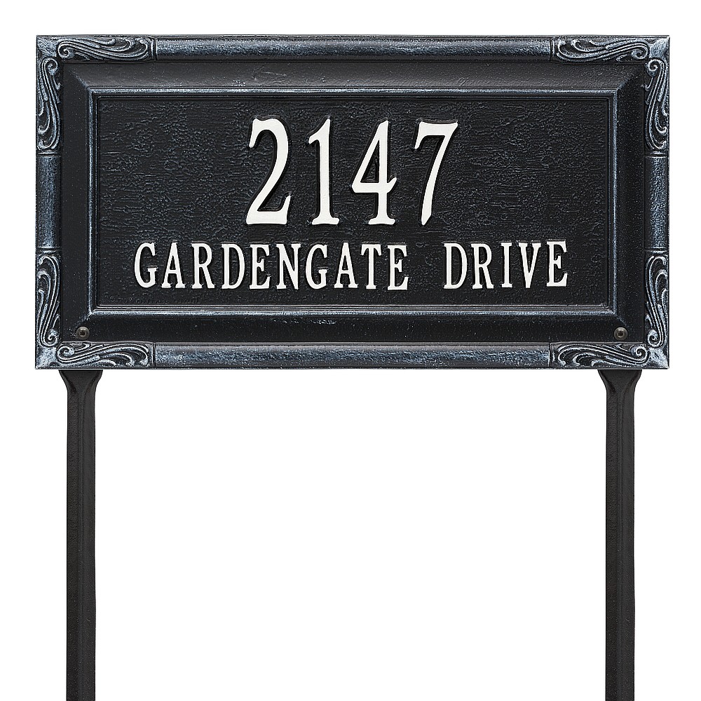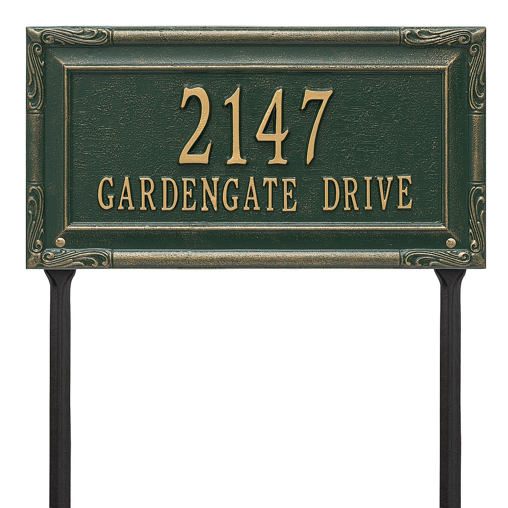 Dimensions (L x W x H): 18 x 9.5 x .375 The Whitehall Gardengate personalized plaque adds instant curb appeal to your home address numbers. The Gardengate plaque features traditional styling and a simulated carved wood accent. Every Whitehall plaque is proudly hand crafted in the USA. Personalization is permanently cast into the sign. Manufactured from cast, high-density aluminum alloy and protected by our exclusive Alumi-Shield all weather coatings. Alumi-Shield All Weather Coating: A Whitehall Exclusive Alumi-Shield – Protects against the harshest weather and environmental elements. Extends the product life and maintains the look and function. Made in the USA.